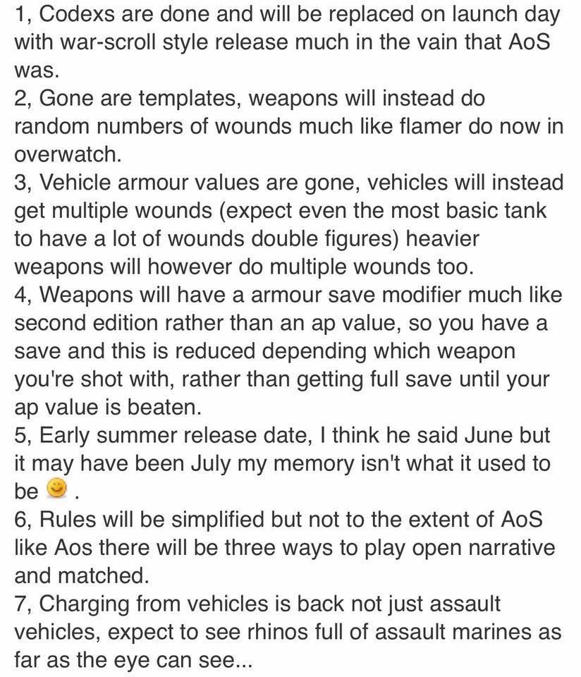 - Los Codex pasarán a la historia y serán reemplazados en el lanzamiento por PDFs estilo los warscrolls de Age of Sigmar. Grandísima noticia si se cumple.
