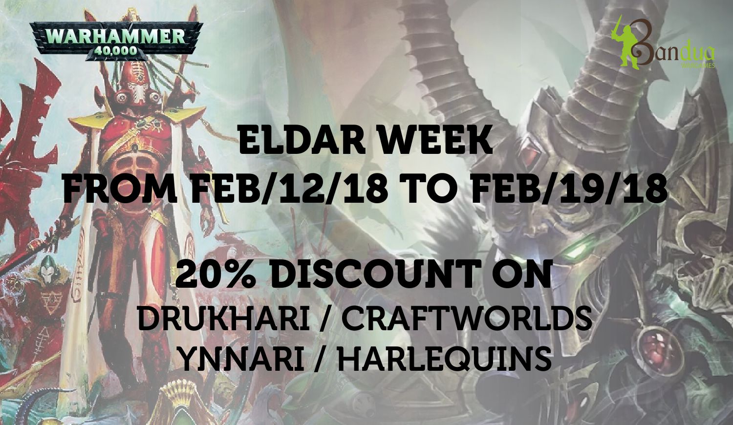 Mundos Astronave, Drukharis, Arlequines e incluso los Ynnari tienen hasta el 19 de febrero un 20% de descuento en Bandua Wargames. Este mes continúa con semanas dedicadas a facciones concretas.