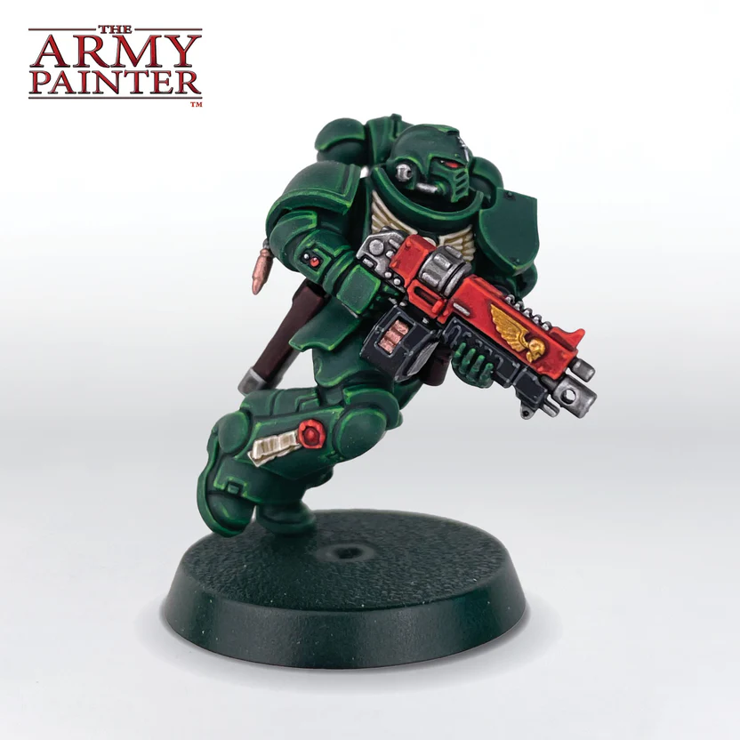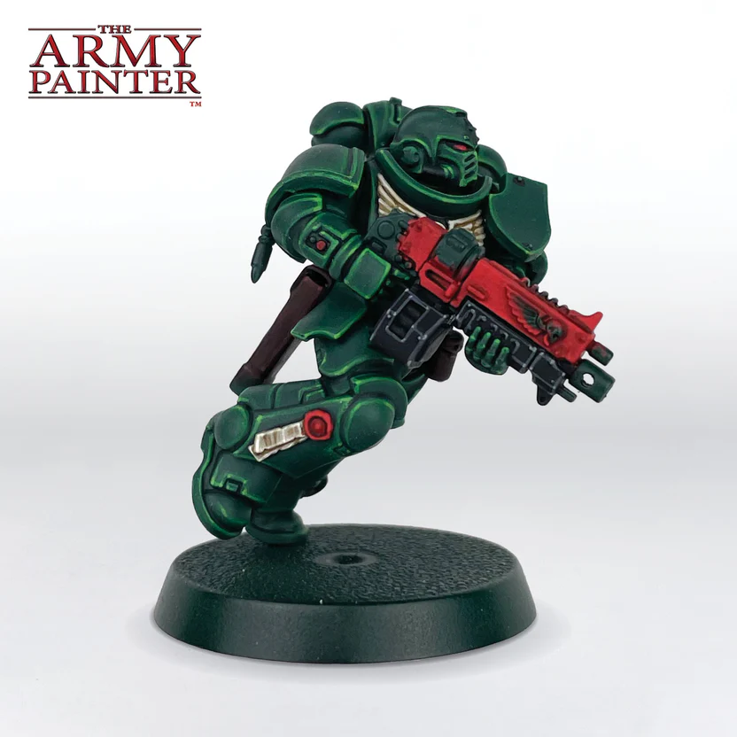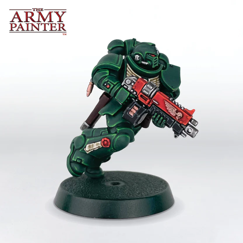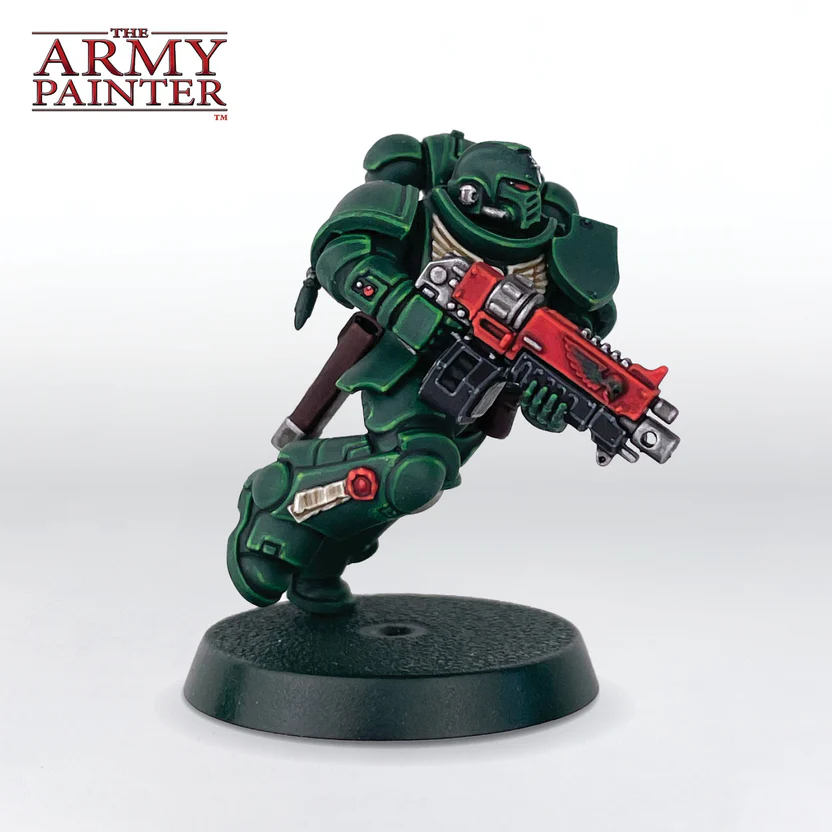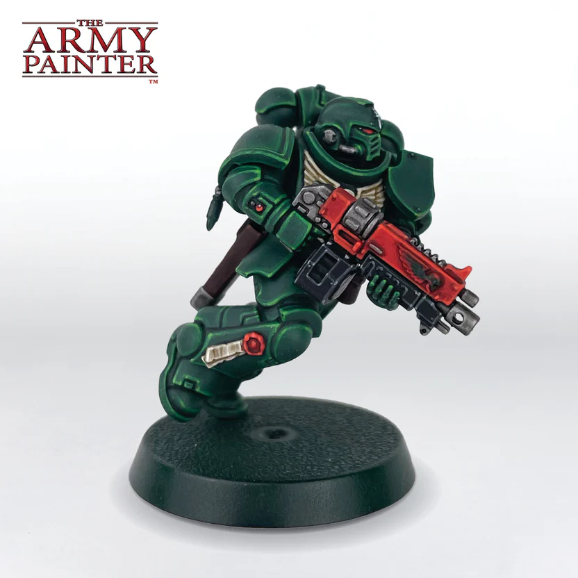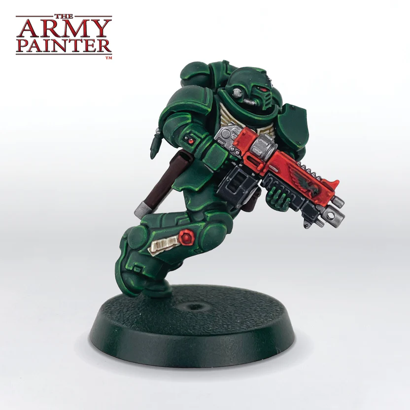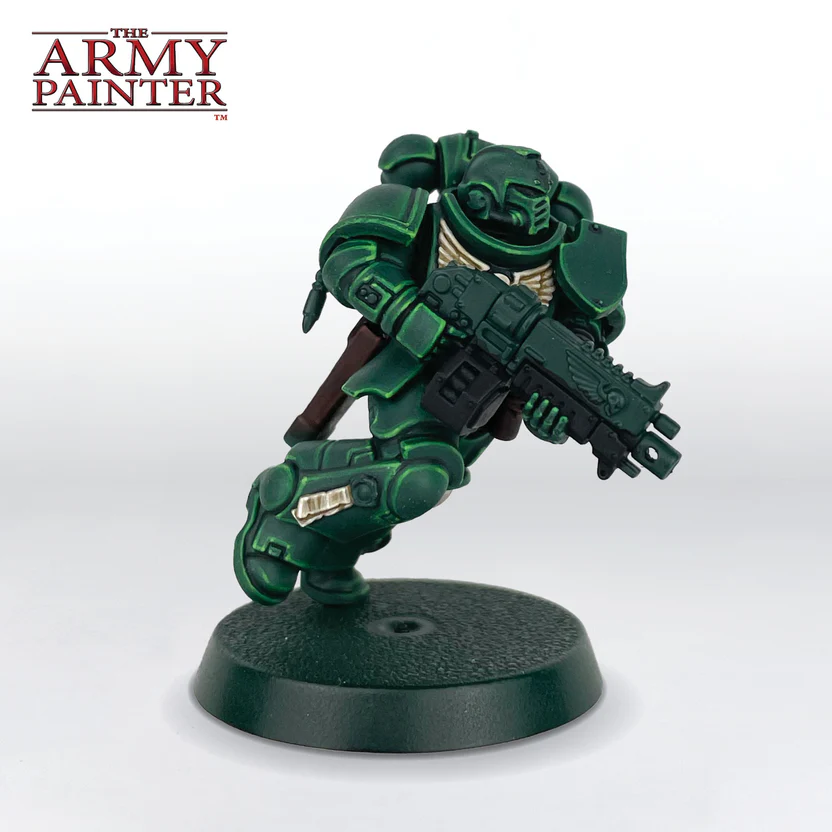 Comencé imprimando el modelo con el Colour Primer Angel Green, y luego retoqué cualquier área que no se hubiera cubierto con el Warpaints Fanatic Angel Green. Ten en cuenta que, aunque los colores coinciden, el acabado es diferente, ya que la pintura acrílica tiene un acabado mucho más mate que el primer. Si planeas barnizar tu modelo al final, lo cual recomendamos, no habrá diferencia, ya que eso igualará el acabado. Apliqué una capa fina y rápida del Warpaints Fanatic por todo el modelo para obtener un acabado consistente mientras pintaba.