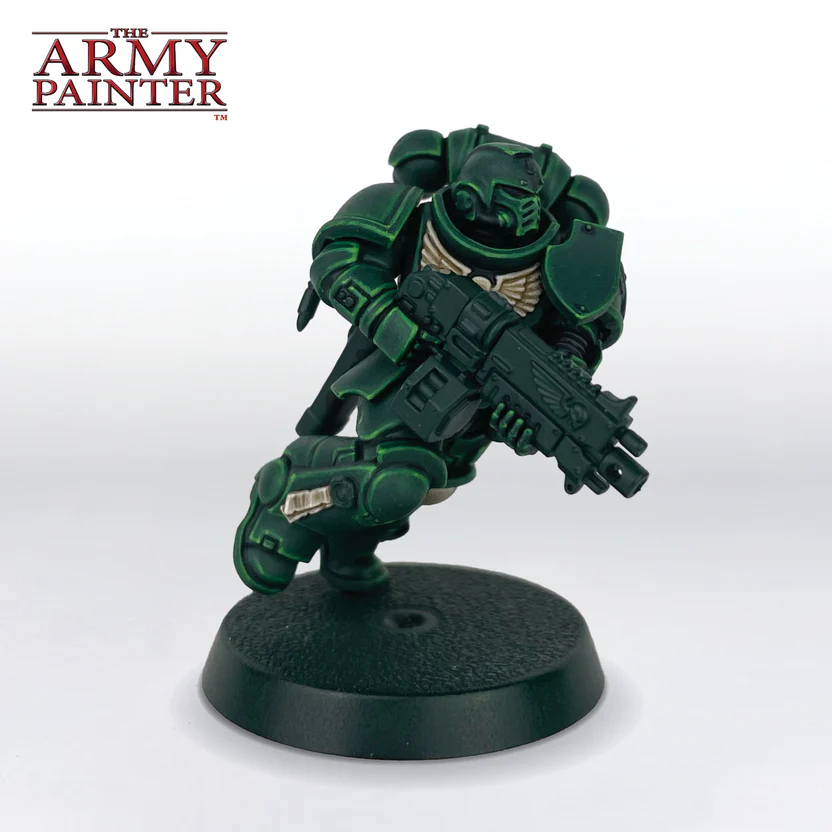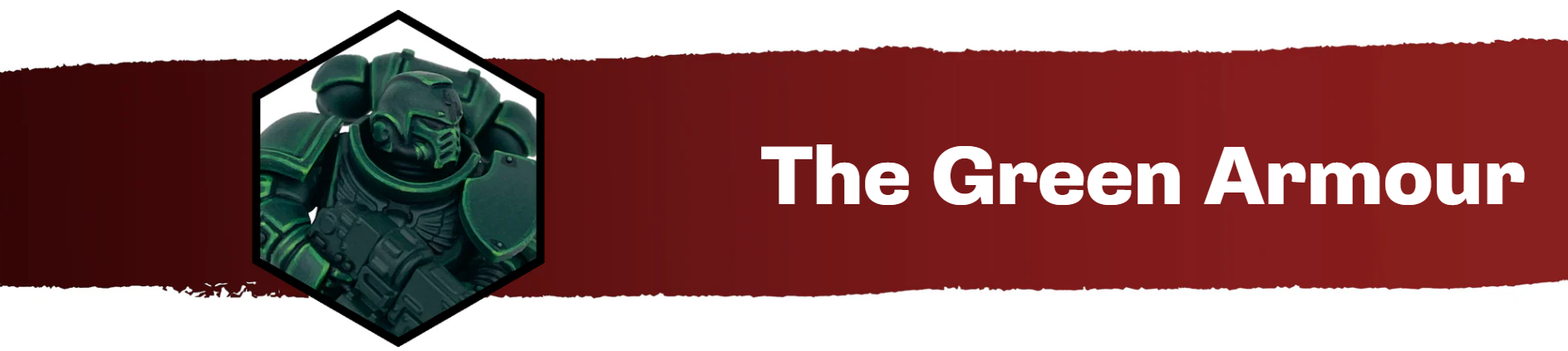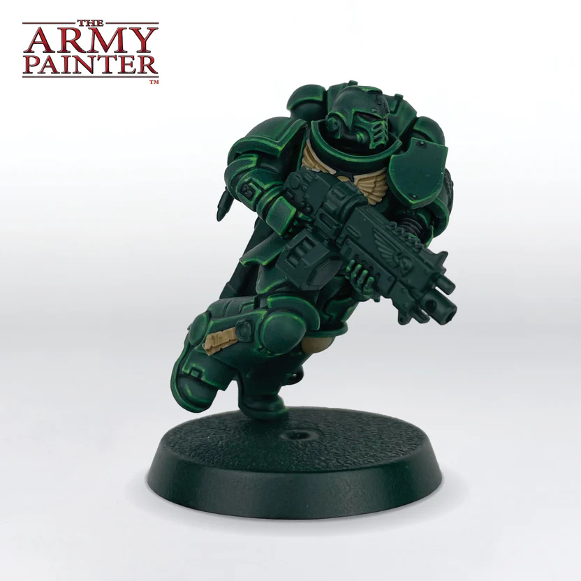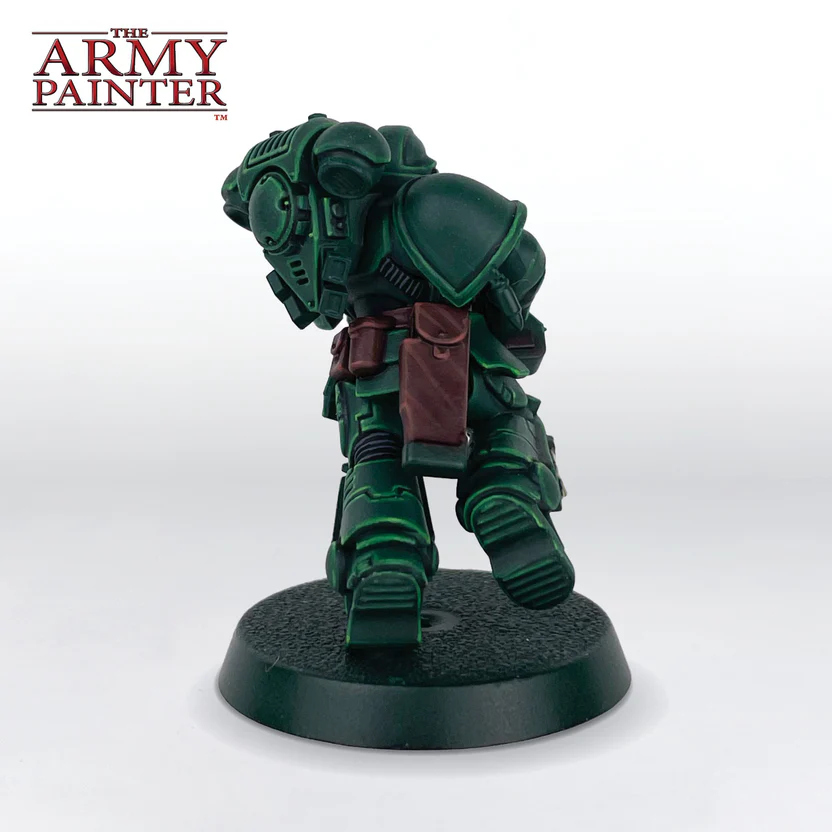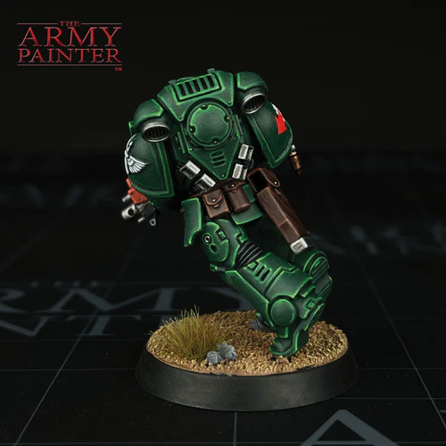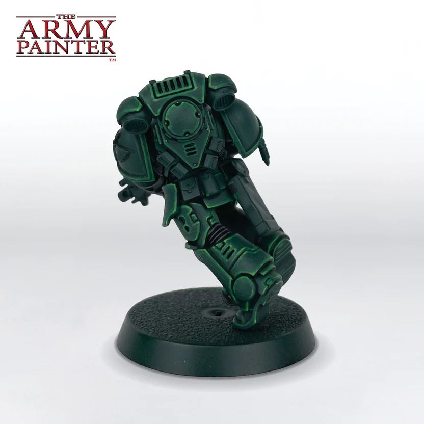 Luego, decidí agregar un poco más de definición, usando una mezcla 50/50 de Warpaints Fanatic Matt Black y Angel Green. Esta mezcla se aplicó en todos los recovecos de la armadura. Puedes retocar con Angel Green puro si es necesario.
