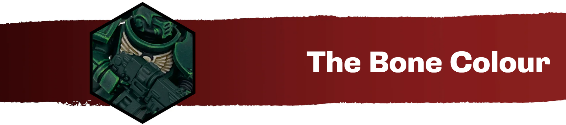 Todas las áreas óseas luego se trataron con una capa de Warpaints Fanatic Skeleton Bone, dejando el Soft Tone en los recovecos. En la rodillera, esto se aplicó a la mitad superior del símbolo de la compañía y se difuminó en el color más oscuro.