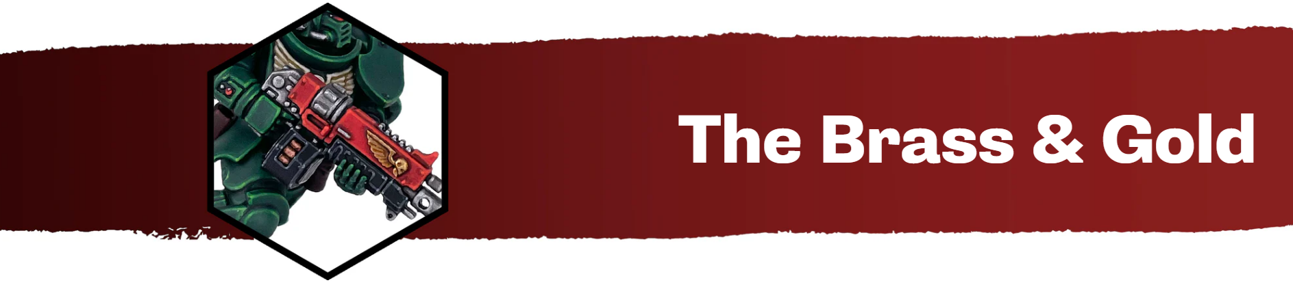 El latón luego fue resaltado con Warpaints Fanatic Evil Chrome donde fuera necesario y el oro fue resaltado con una mezcla de Warpaints Fanatic Greedy Gold y Mithril.