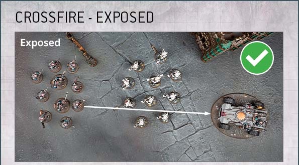 Al recibir ese marcador, otras unidades de Fuego Cruzado pueden dispararle con +1 a impactar. Y si además esa unidad está Expuesta, con +1 a herir. ¿Y en qué consiste estar Expuesto? En que se pueda trazar una línea desde la peana de la unidad atacante hasta la de otra miniatura con clave Fuego Cruzado y que pase sobre la unidad enemiga que se quede Expuesta.