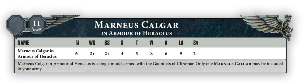 La Resistencia 5, sus 8 Heridas y sus 6 Ataques lo hacen tener un perfil superior al de cualquier personaje Astartes, excepto el Primarca Guilliman. Su nueva Armadura de Heraclus (una Mark X Gravis) le permite moverse sin impedimentos, con invulnerable 4+ y reduce todo el daño recibido a la mitad. Por lo demás, no avanzan otras reglas nuevas para él.