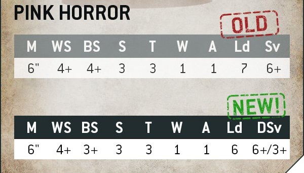 El nuevo perfil de los Desangradores de Khorne deja claro que se defienden bien contra disparos, al 4+, pero en combate a Khorne le importa menos de quién sea la sangre. Por otro lado, el nuevo perfil de los Horrores indica que en cuerpo a cuerpo son absolutamente frágiles, al 6+, pero a disparos tienen un impresionante 3+ inmodificable. Además, matar a un Horror provocará que aparezcan otros dos, como de costumbre en estos demonios menores de Tzeentch.