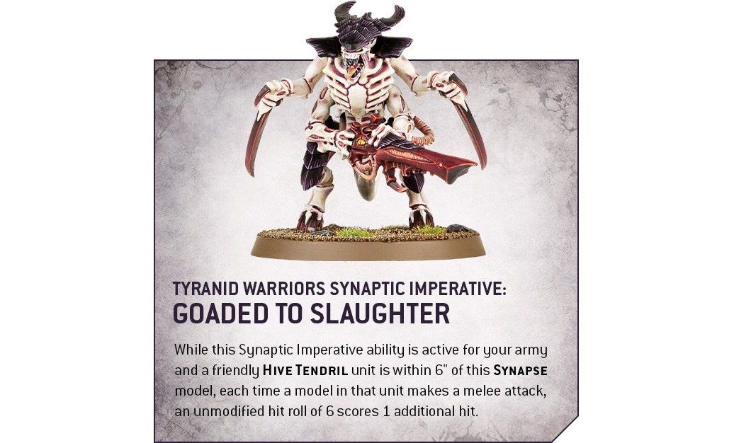 Si el ejército es monocodex Tiránidos y de una misma Flota Enjambre, al inicio de cada ronda de batalla se puede activar una Imperativa Sináptica. Son auras que se irradian desde cada unidad con la clave SINAPSIS del ejército durante esa ronda. Hay un total de 10 para elegir. Cada criatura sináptica otorga acceso a distintas Imperativas Sinápticas. Por ejemplo, tener en lista algún Tirano de Enjambre da acceso a poder elegir esta imperativa: