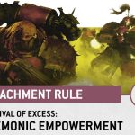 Sobre los otros cuatro Destacamentos, sabemos ya que uno permitirá repetir los avances, mientras otro mejorará a los que desembarque de transportes que además podrán ir a reservas estratégicas y desembarcar sus tropas hacia el combate. Uno más se centrará en el combate cuerpo a cuerpo y hasta permitirá a tu mejor personaje combatir dos veces en una fase de combate. El último de ellos servirá para mezclar Demonios de Slaanesh con guerreros mortales.