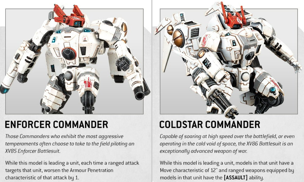 Aparte del Destacamento, algo general sobre los T’au es que a partir de ahora tendrán a sus armaduras Crisis diferenciadas con distintas hojas de datos según su equipamiento.