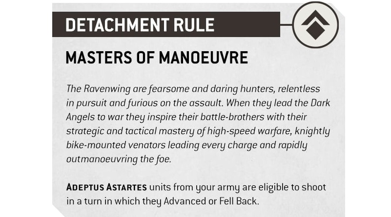 Los propios Outriders son LÍNEA DE BATALLA en este Destacamento, para no tener que utilizar Infantería si no se desea. Quienes sí son parte del Ala de Cuervo son los Land Speeder Venganza, la Mortaja, las aeronaves Dark Talon y Nephilim, y por supuesto Sammael.