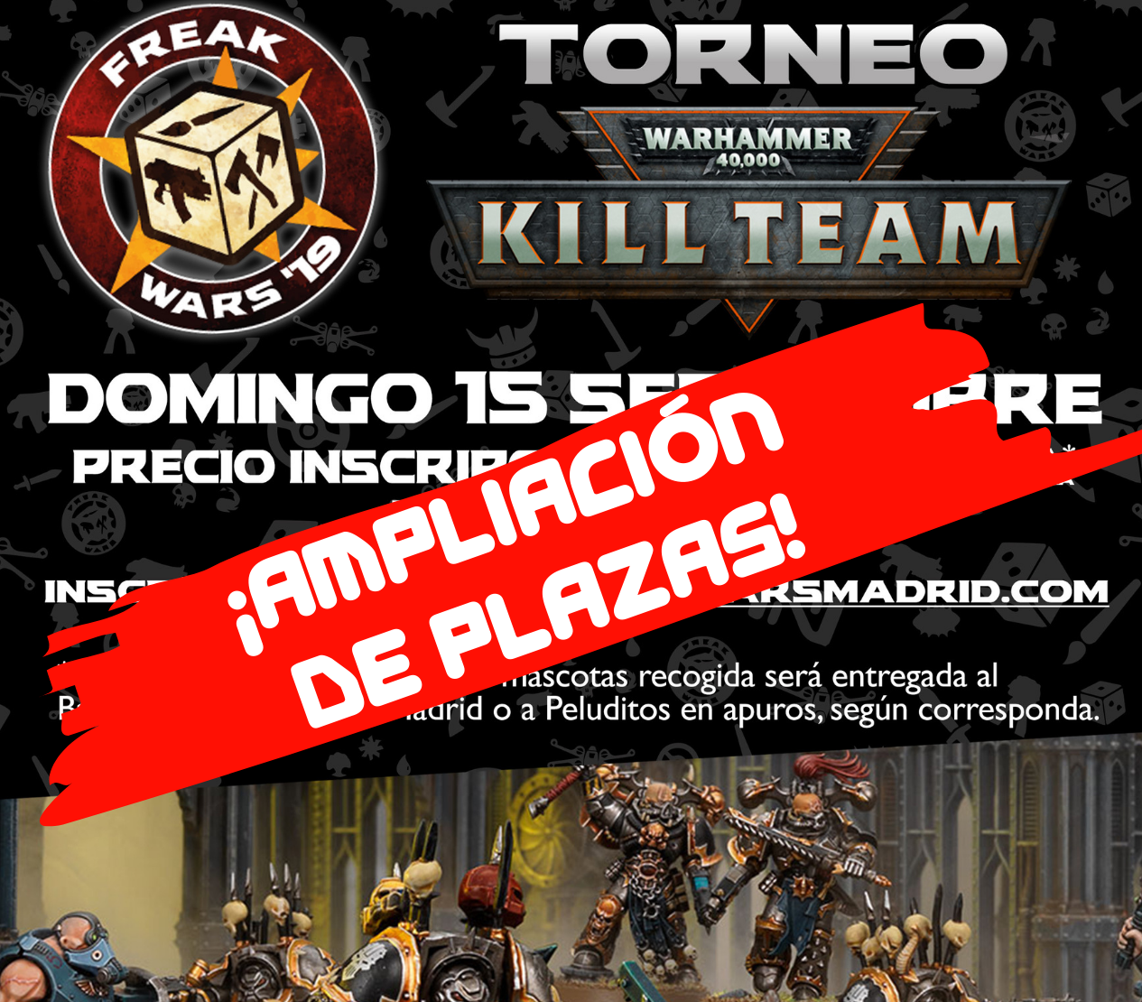 En apenas 8 horas se agotaron todas las plazas del torneo de Kill Team de las Freak Wars 2019. Así que hemos decidido junto al resto de organizadores y el apoyo de Freak Wars afrontar una ampliación de plazas de 24 a 40 jugadores. ¡No te pierdas esta nueva oportunidad de participar!