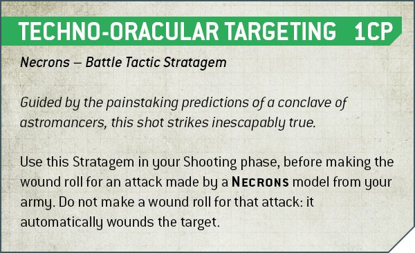 Un total de 40 estratagemas podrán ser utilizadas por los Necrones gracias a su nuevo Codex, además de las estratagemas genéricas del reglamento de Warhammer 40.000. Una novedad de los nuevos Codex es que ahora las estratagemas se dividen en categorías.