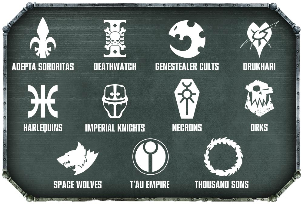 Hermanas de Batalla, Deathwatch, Cultos Genestealer, Drukharis, Arlequines, Caballeros Imperiales, Necrones, Orkos, Lobos Espaciales, Imperio T’au y Mil Hijos. Las facciones que faltan reciben reglas expandidas en Chapter Approved 2017.