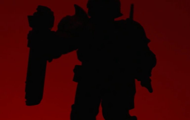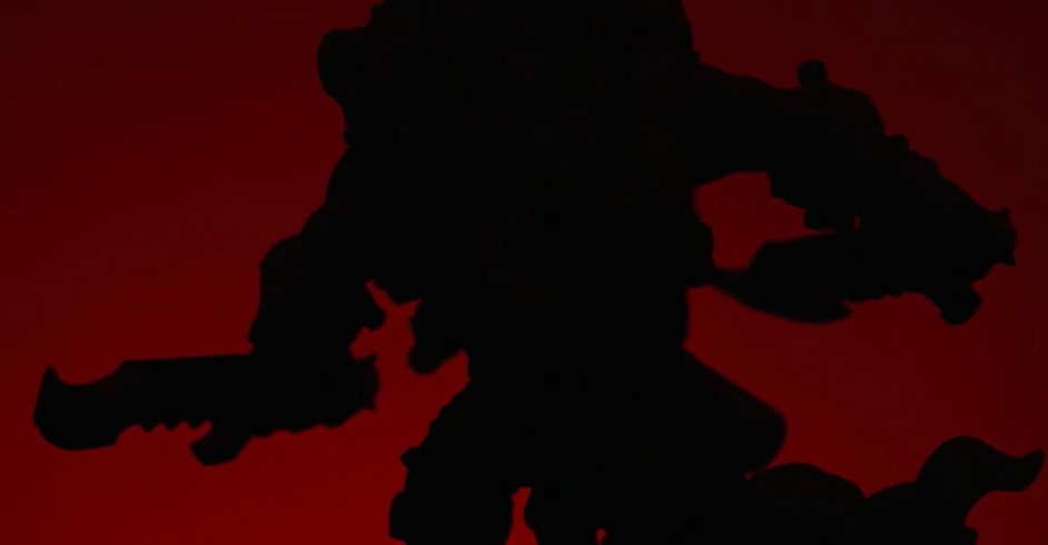 Pero vamos a lo importante: las misteriosas siluetas de lo que viene en 2023. Para empezar, con lo que parece ser una imagen llegada del Sistema Tarmoth con un marine espacial portando un arma pesada de grandes dimensiones. ¿Quizá un lanzamisiles?