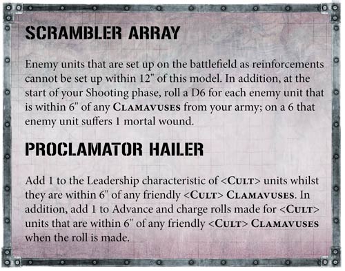 Los Clamavuses afectan al enemigo y potencian a tus unidades. Por una parte, el enemigo no podrá desplegar a 12” de ellos, y si está en algún momento a 6”, al inicio de tu fase de disparo, tiras un dado y con un 6 sufre una herida mortal. Por la otra, tus unidades a seis pulgadas del Clamavus suma uno a las tiradas de cargar y avanzar.