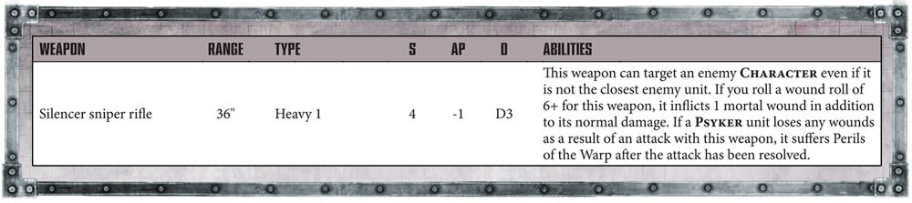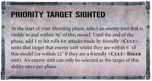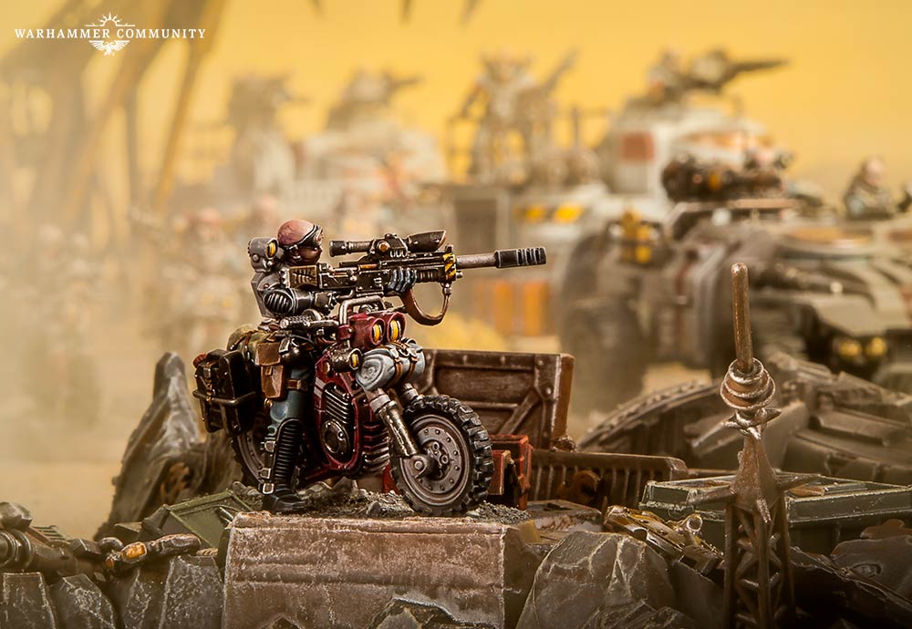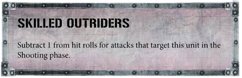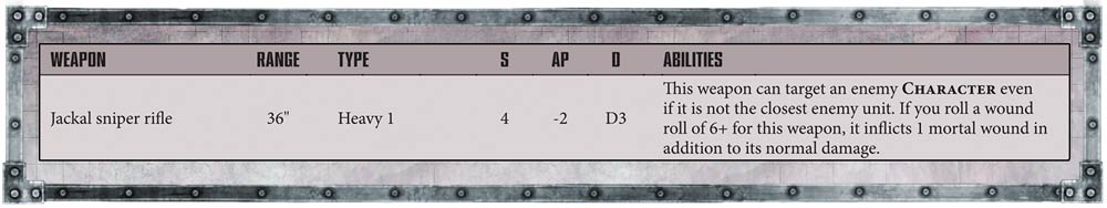 Un Chacal Alphus es el HQ apropiado para liderar un destacamento Outrider con Chacales y Ridgerunners. Con habilidad de proyectiles +2 y su potente rifle de francotirador, puede cazar personajes.