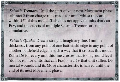 Y no solo eso, controlarás las cargas, haciendo que cualquier unidad que esté a 12” reste dos a la distancia de carga (también tus unidades!). Y lo más loco, haz una linea que cruce el campo de batalla, a través del Taladro. Toda unidad tocada, a +4, se come 1D3 heridas mortales y reduce su movimiento a la mitad.