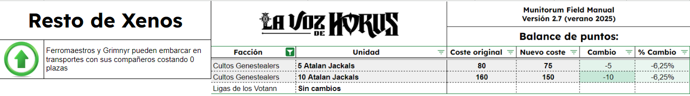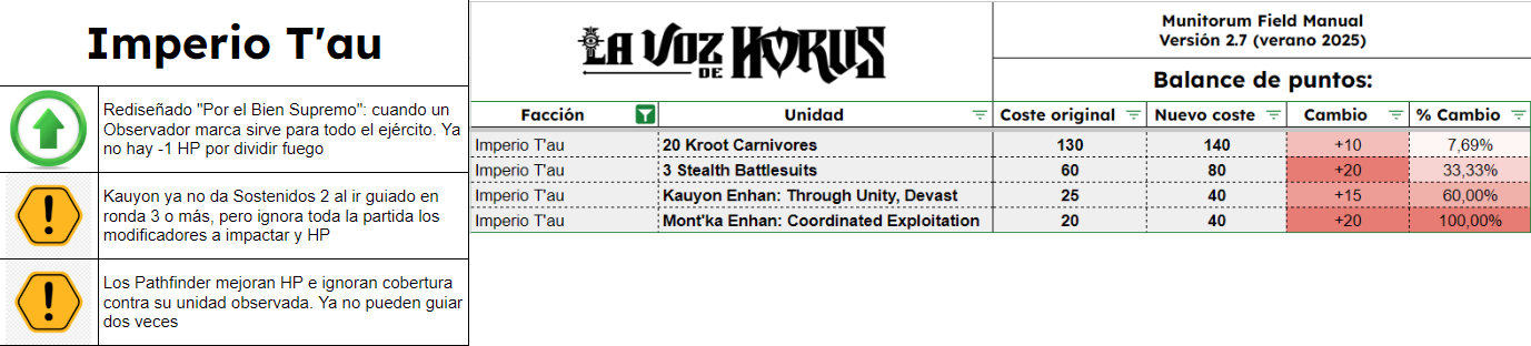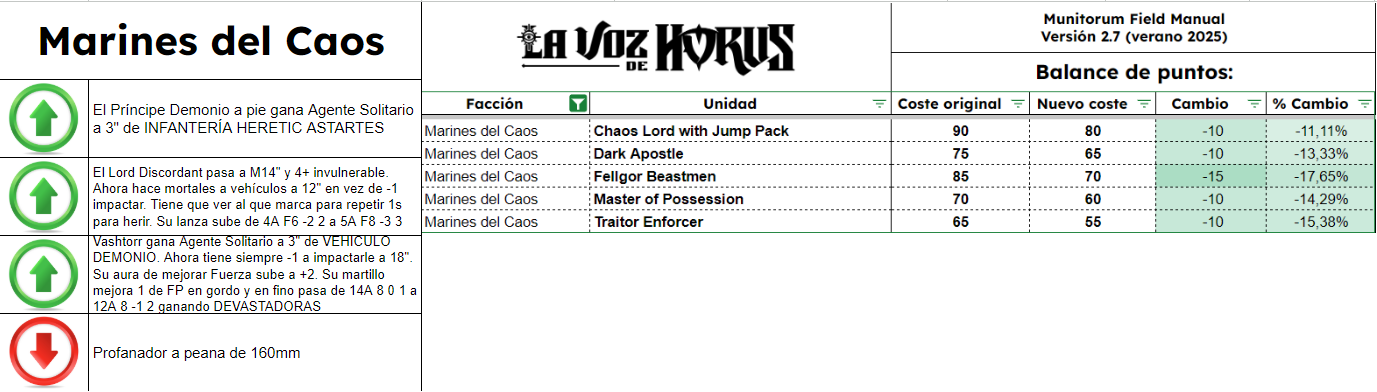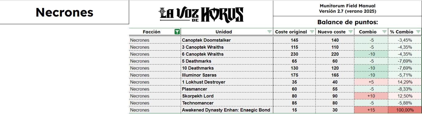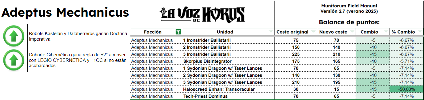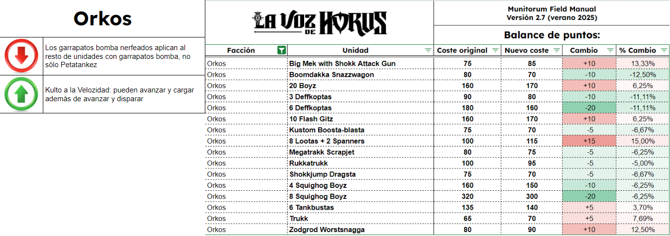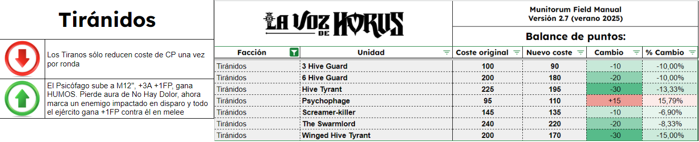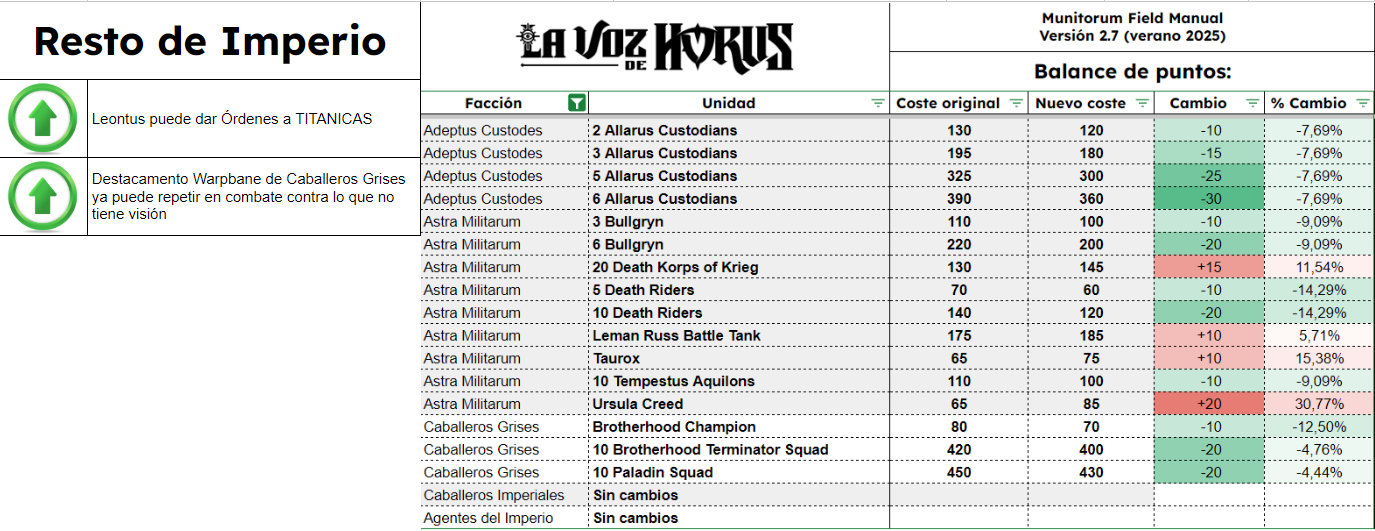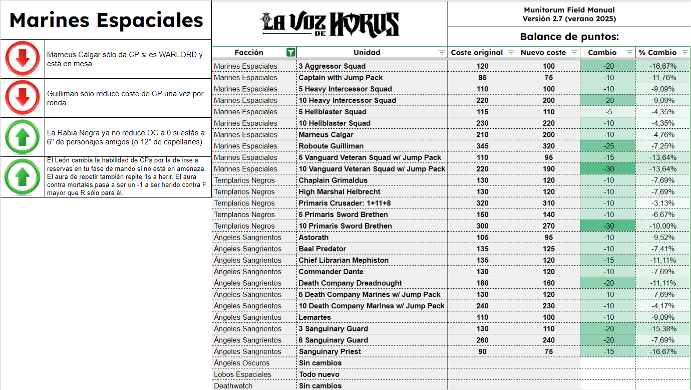 El Manual De Campo Munitorum 2.7 es el documento que define el coste en puntos de cada unidad de Warhammer 40k. Junto a él está el documento de Balance Dataslate y muchos otros pequeños ajustes en diversos documentos, todos reflejados también en la app móvil oficial de Warhammer 40k. Quizá la mayor novedad es la lista de tamaños de peana de todas las unidades del juego, como parte del Tournament Companion. Os contamos qué cambia y cuánto, en completo detalle, aquí en La Voz de Horus.