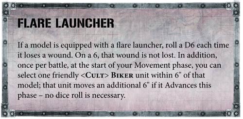 Cada uno de estos vehículos lleva un lanzador de bengalas, que hará que tus motoristas avancen el máximo, y además mejorará su supervivencia logrando que ignore heridas a +6