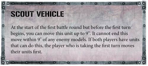 En batalla, son capaces de adelantarse a las fuerzas gracias a su habilidad de vehículo de exploración, que les permite avanzar nueve pulgadas antes de que empiece la batalla, como otras tantas unidades que tienen una regla similar.