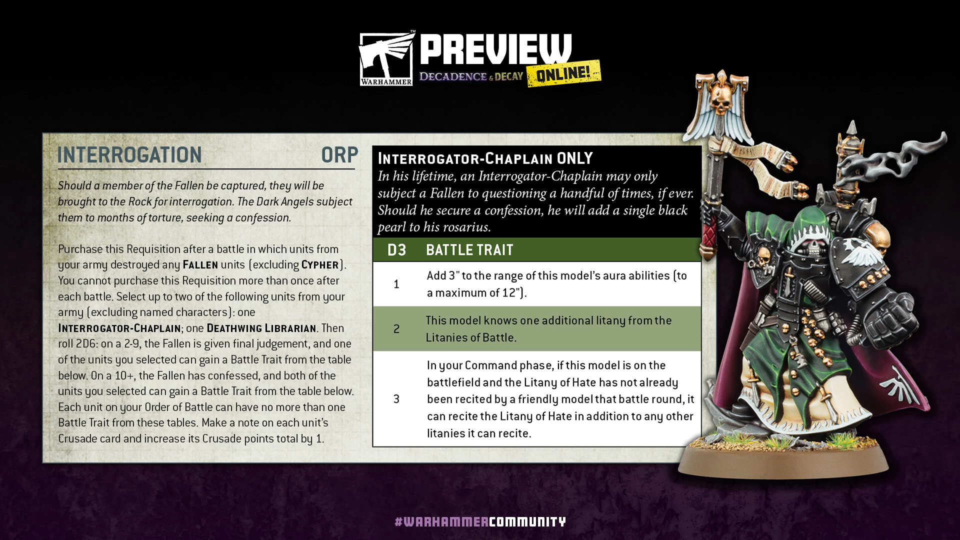 El suplemento permitirá utilizar Destacamentos de Vanguardia del Ala de Muerte y Destacamentos de Batidores del Ala de Cuervo que tendrán Objetivo Asegurado en ambos casos. Es decir, tanto el destacamento de Élites como el de Ataque Rápido podrán controlar la mesa para los Ángeles Oscuros.