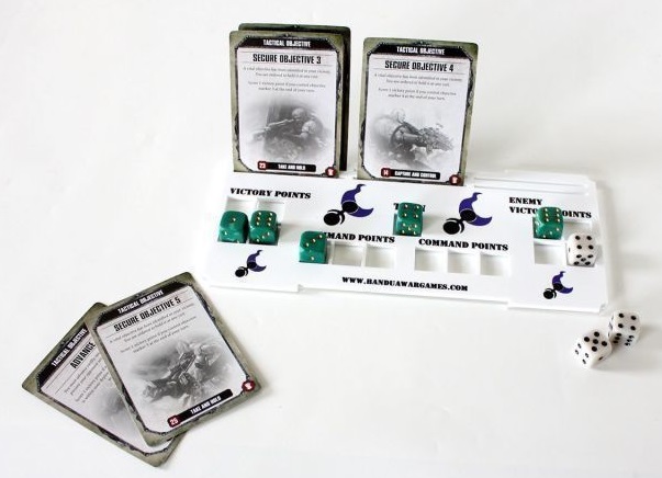 Y dos consolas de control de puntos de mando y puntos de victoria, incluyendo además algunos objetivos tácticos numerados y una regla de 6″: