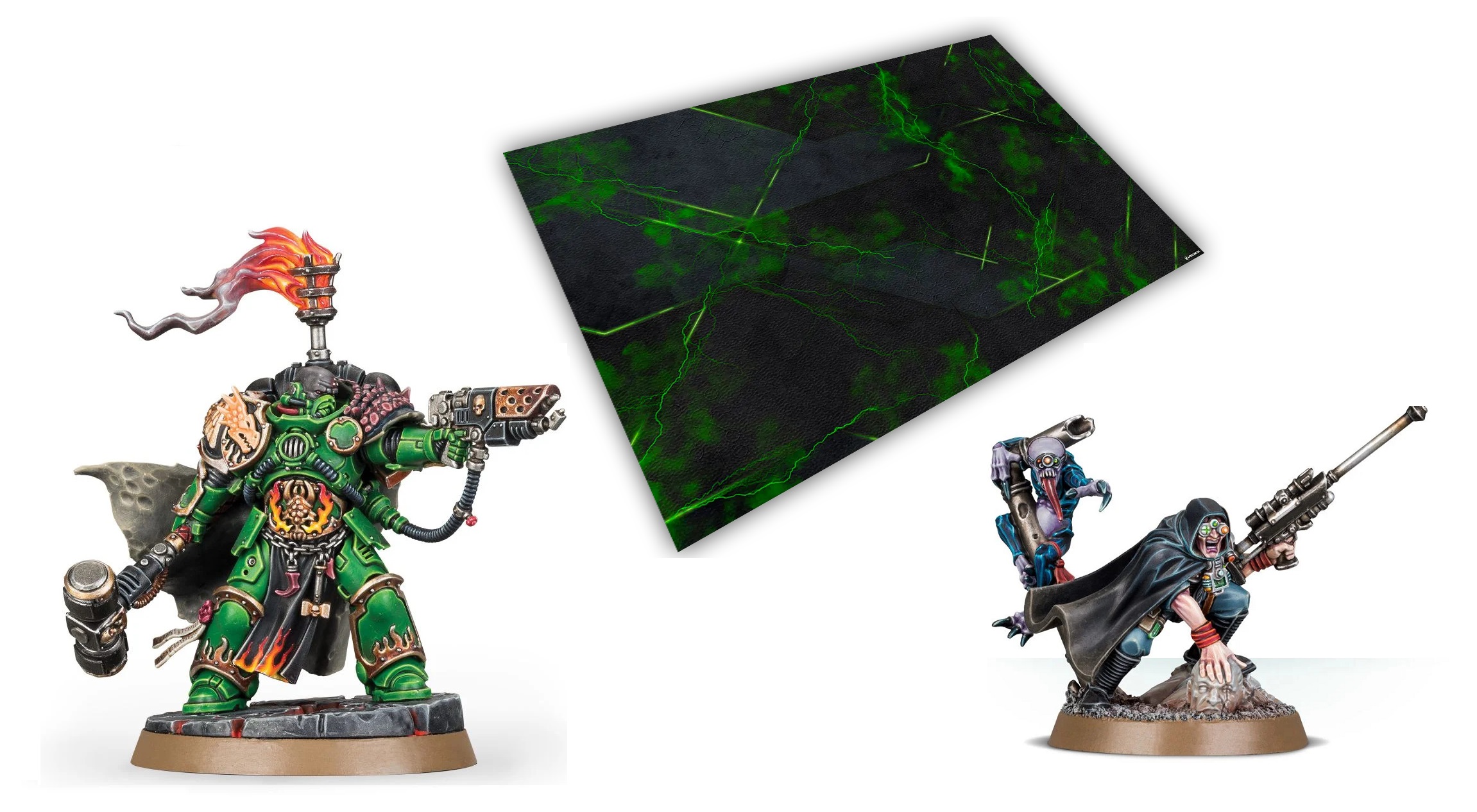 Recordemos el premio de este sorteo: un tapete de Mundo Necrontyr de ModelBrush, el siempre imponente Capitán Adrax Agatone de los Salamandras y el sibilino asesino Sanctus del Culto Genestealer.