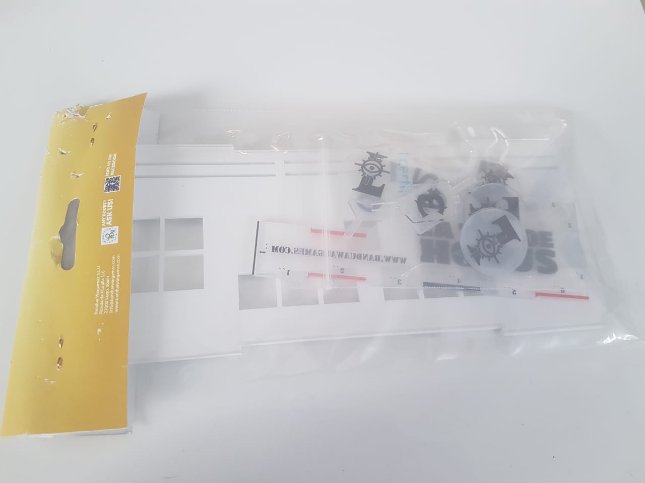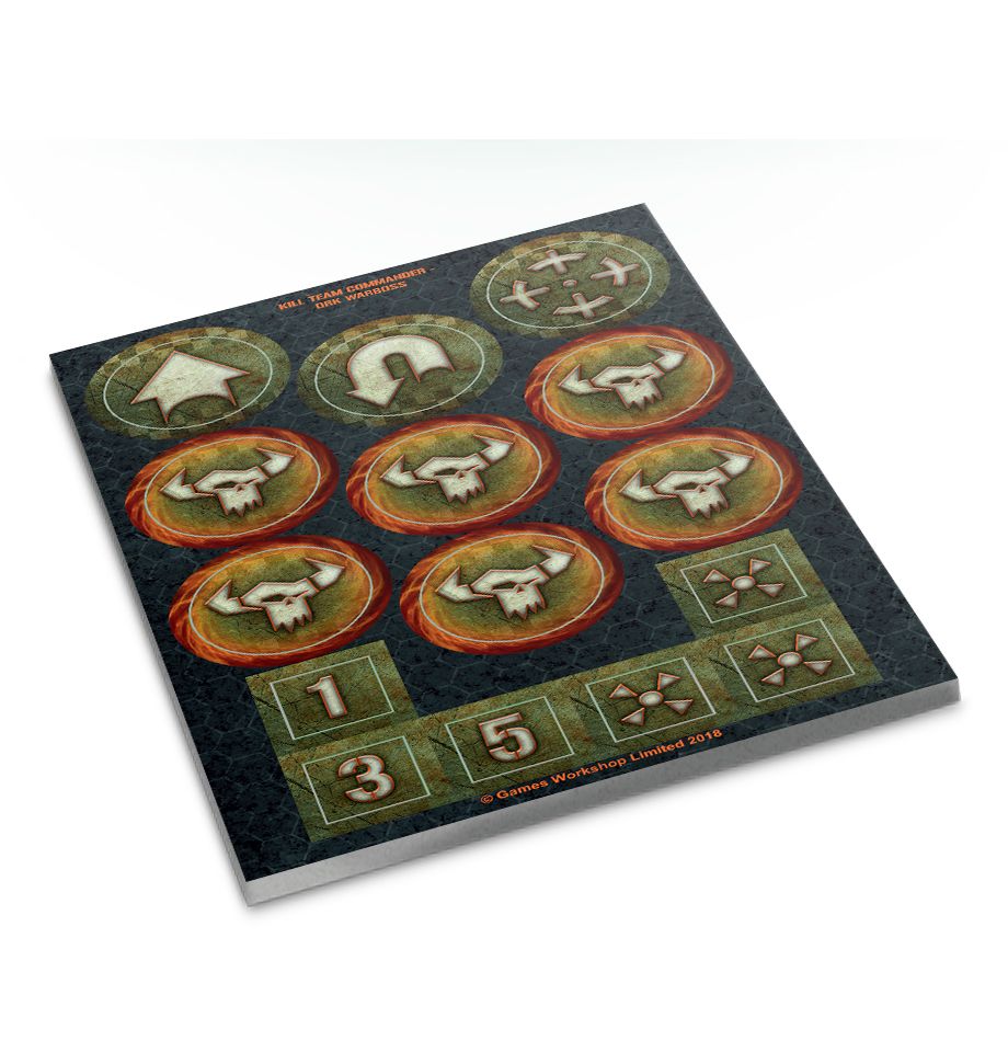 Al Comandante Orko hay que añadirle una consola de control personalizada de La Voz de Horus junto a 6 objetivos tácticos numerados para partidas de Warhammer 40.000 y una regla para medidas rápidas de 6″, 2″ y 1″: