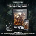 Legión Negra; 1cp: da todas las marcas del caos durante un turno a una unidad no alineada; 3cp: controla objetivo si hay unidad al alcance, aunque el otro tenga objetivo asegurado; 1cp: +1 ataque si superas al enemigo en número; 1cp: +1Ld a unidades que no sean Legión Negra a 6″ de unidades de Legión Negra; 1cp: si tienes a un Señor, Príncipe o Abaddon como señor de la guerra, puedes darle rasgos de señor de la guerra a un hechicero y un apóstol; Reliquias: espada sierra de FP-3, daño 2, +2A que a 6+ al herir hace una mortal adicional. Yelmo de -1HP, +1FP. Capa de +1A +1F +1Ld por cada personaje eliminado. Trofeo de +1Ld a unidades de Legión Negra y -1Ld a enemigos a 6″. Espada de energía de F+1 FP-3 +d6A. Rasgos: retirarse y cargar. Daño recibido a la mitad. +1F y a 4+ d3 mortales al cargar. Recuperar puntos de mando a 5+ al usar estratagemas. MaFE a 5+.