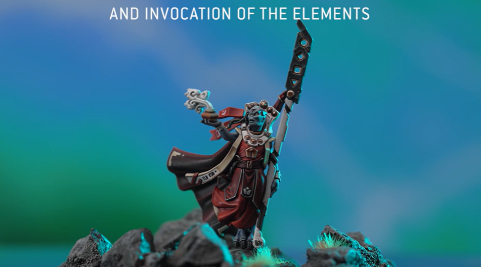 Para representar el poder de los Etéreos sobre las cuatro castas, la miniatura se llama Invocación de los Elementos y puede montarse con cualquiera d los cuatro elementos saliendo del mismo frasco. Su ropaje lleva las inscripciones de la casta de los Etéreos y la piedra táctica sobre la que se alza es un aquila imperial rota.