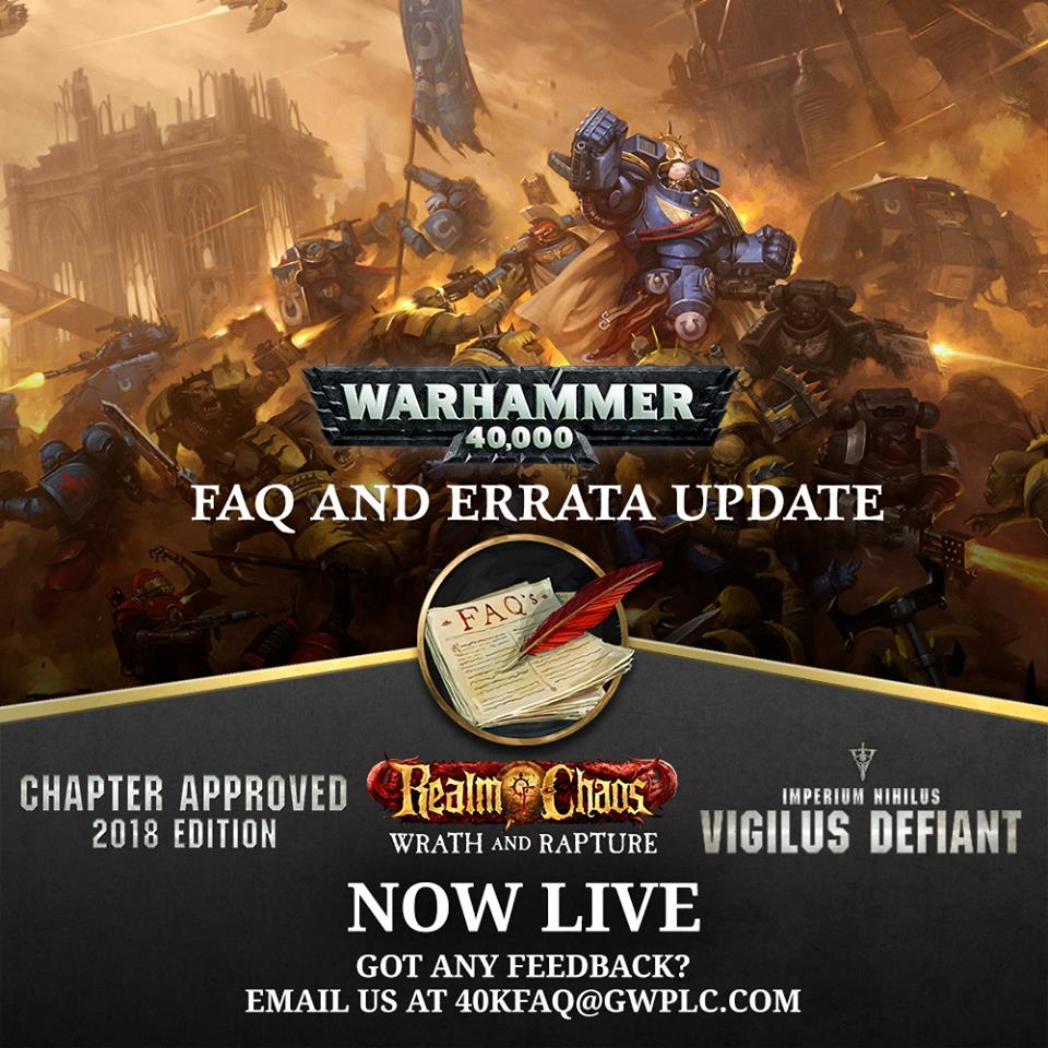 Desde hoy están disponibles para descargar las FAQs de los últimos lanzamientos de reglas: Chapter Approved 2018, Vigilus Defiant y Wrath and Rapture.