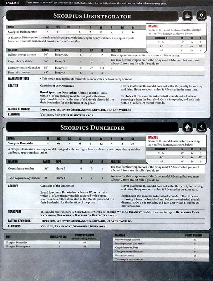 Como transporte, por 73 puntos el Skorpius Runerider juega en la categoría de unidad del Rhino. Se confirma que no podrá transportar Kataphrons. Como tanque de disparo, el Skorpius Disintegrator por 111 o 116 puntos y R7 aporta una plataforma móvil de disparo muy interesante para el Mechanicus.