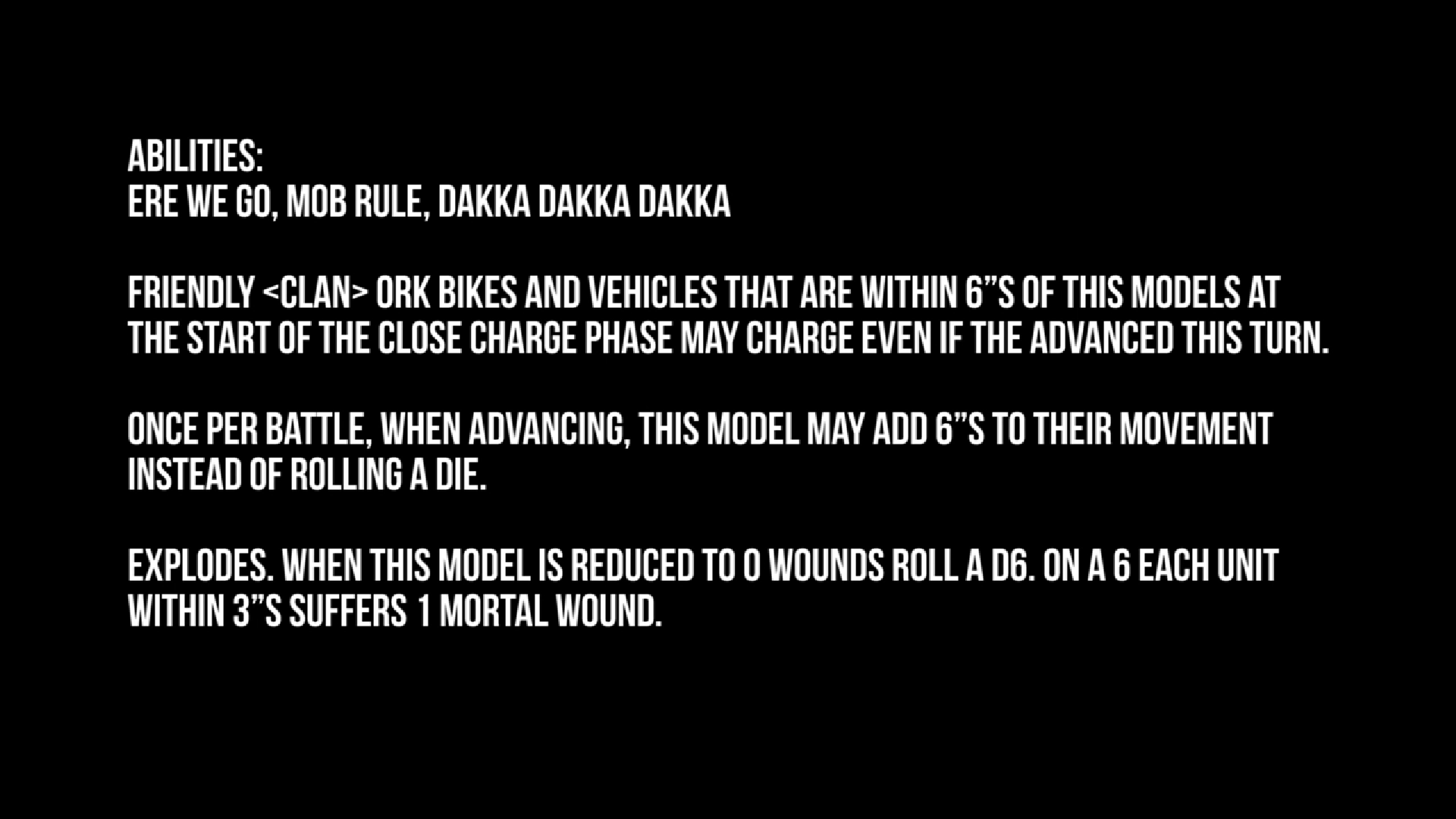 Moviéndose 14″ con un avance seguro de 6″ y pudiendo cargar tras avanzar, el Kaudillo en Triciklo es una de esas pocas miniaturas que tiene muy sencillo hacer cargas de turno 1. Con su aura de 6″ que permite a otros vehículos y motos cargar tras avanzar, puede que vaya bien acompañado en su carga con otros buggies, dreads y motos, por no hablar de vehículos más grandes. Además, sus 8 Heridas le permiten estar protegido del enemigo tras otros Orkos.