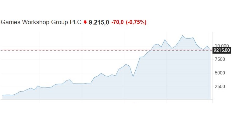 A nivel bursátil, el valor de las acciones de Games Workshop ha fluctuado bastante el último año, como puede verse en esta gráfica a 5 años. En algunos medios se indica que puede ser el momento de comprar acciones: