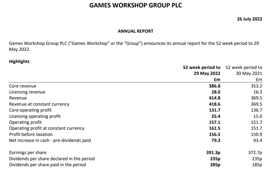 Desde hace años comentamos los excelentes resultados de Games Workshop en sus informes anuales o semestrales, fiel reflejo de la presente edad dorada de la compañía gracias a Warhammer 40k, Age of Sigmar y la excelente gestión de su propiedad intelectual y licenciamiento a terceros, entre otros factores.
