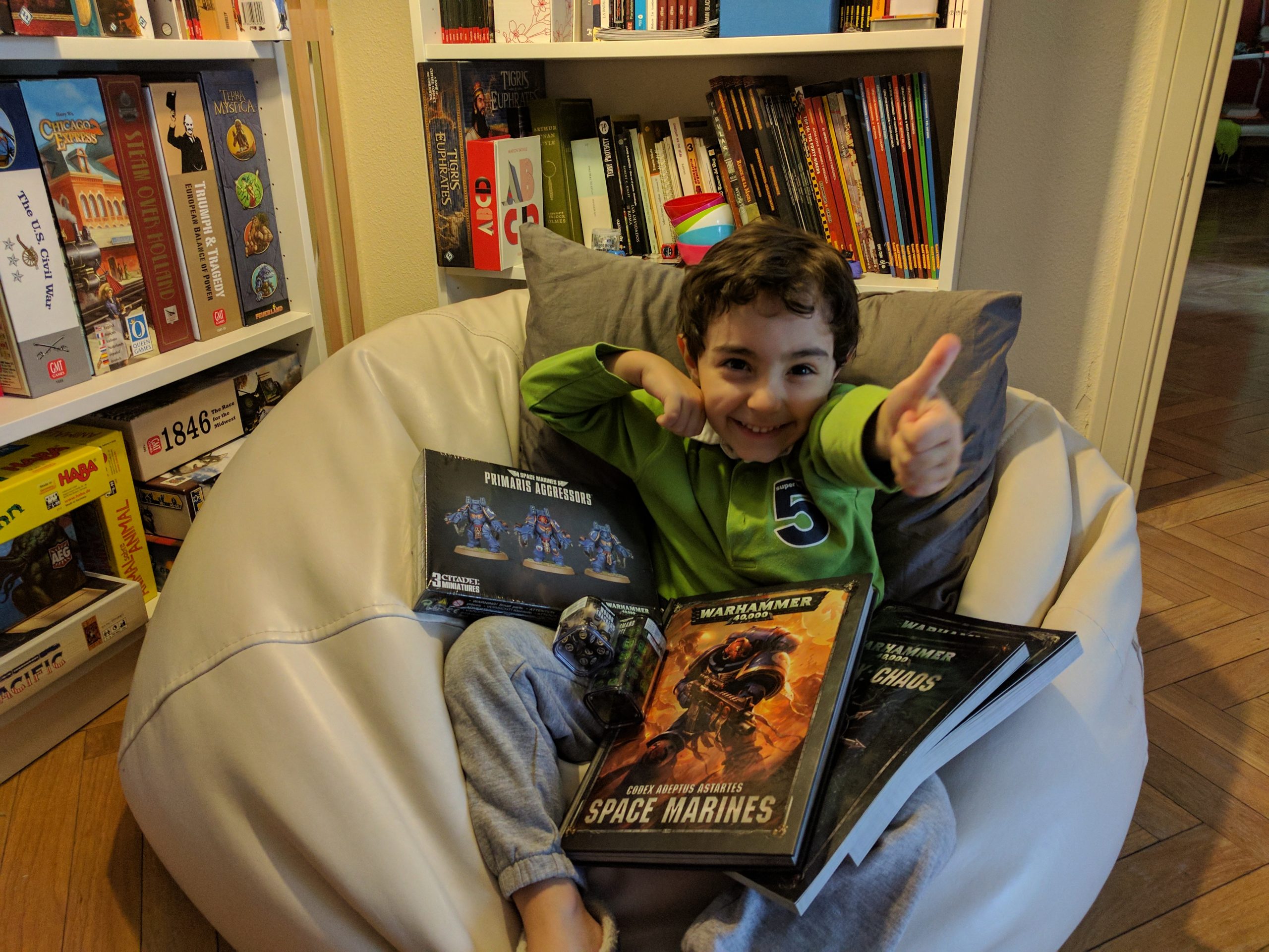 Pedro nos ha enviado ya su foto con el premio de este mes, que ganó en el sorteo celebrado el pasado jueves y que consiste en una caja de Agresores, un Codex: Marines Espaciales (en inglés), dos Index a su elección y dos cajas de dados (de mando y de heridas).