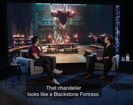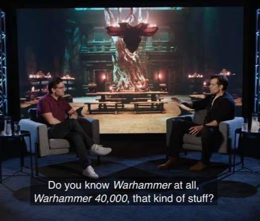 En este vídeo que tuitea Alfabius podemos ver cómo Cavill está fascinado porque en ese escenario en el que rodaba cada día The Witcher hacía algo que no podía compartir con nadie. Le tocaba rechinar los dientes porque nadie le entendería allí si dijera lo evidente: esa cosa negra flotante que está en Kaer Morhen en la temporada 2 de The Witcher, ese candelabro, es claramente una Fortaleza Negra de Warhammer 40k.