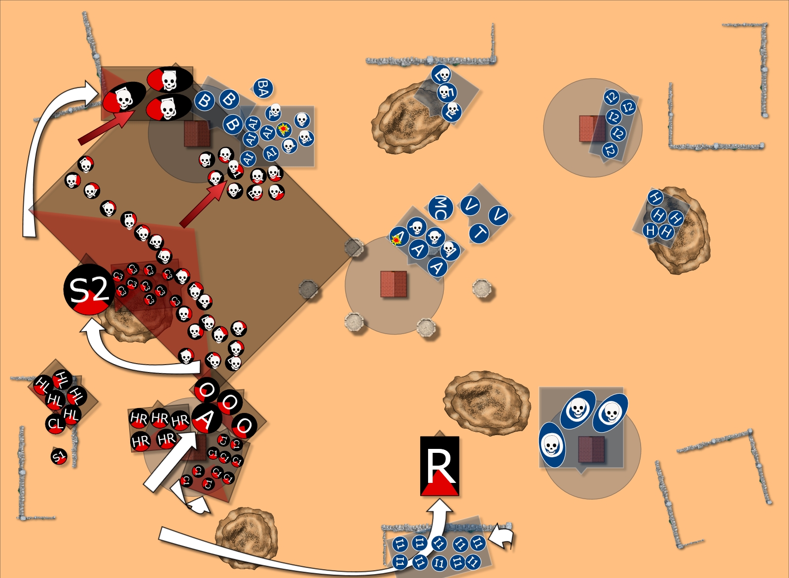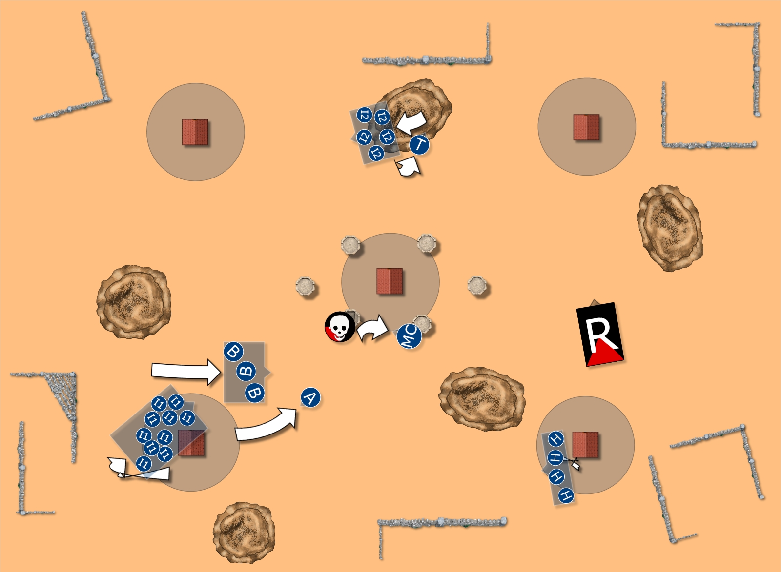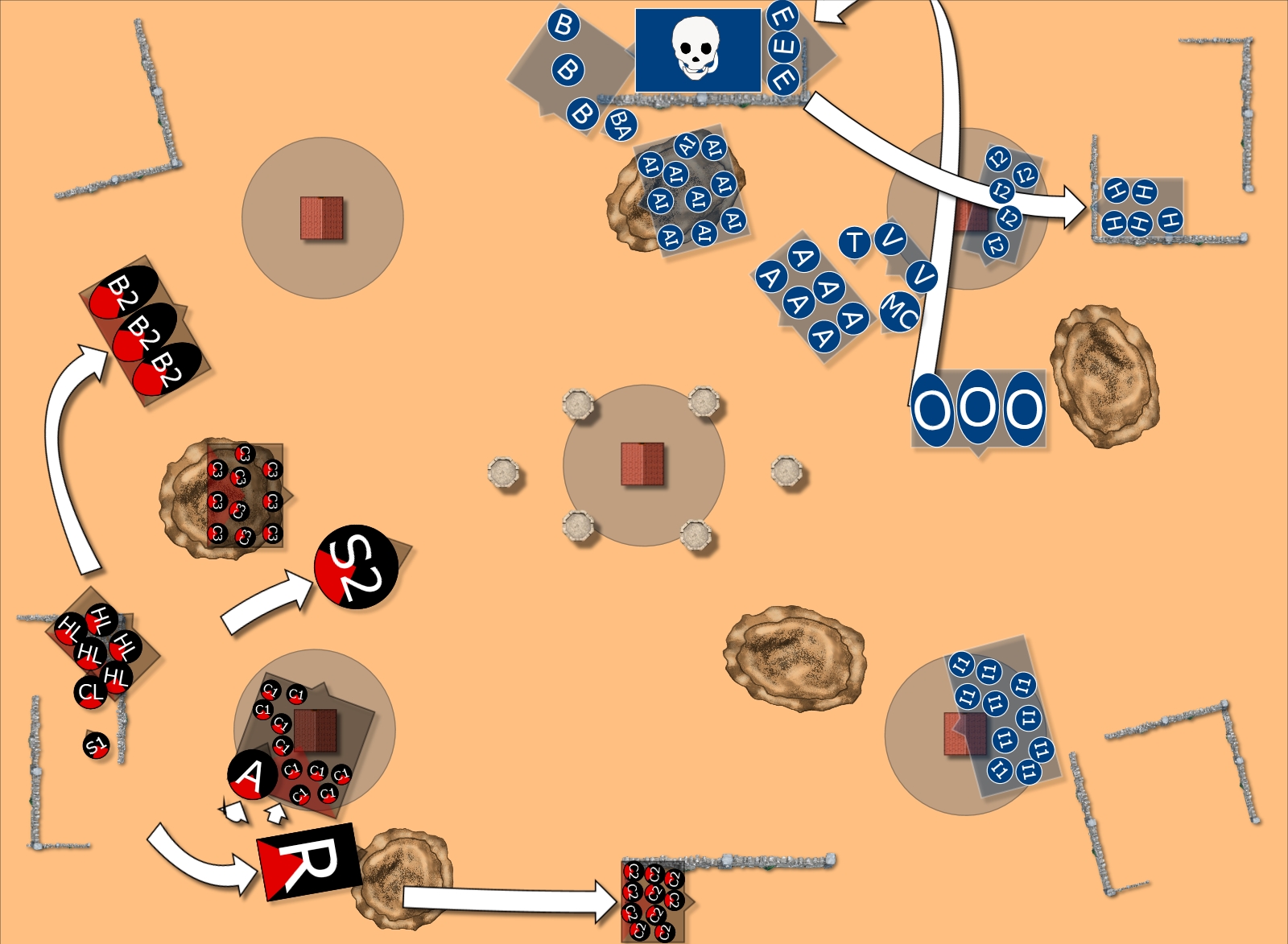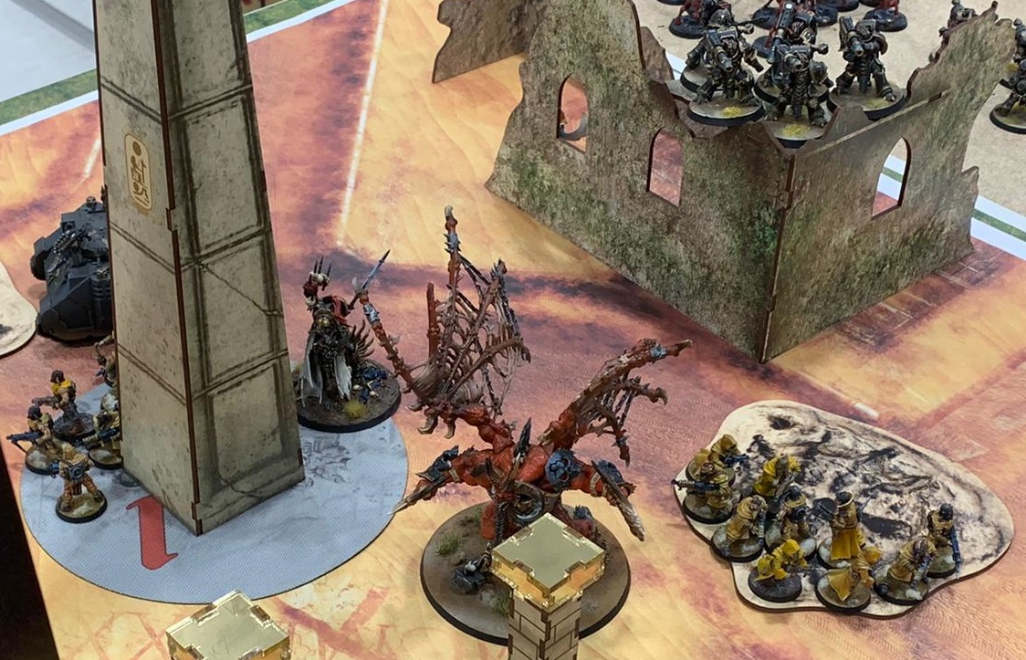 Como regla de la casa, en cada objetivo hay un monolito de escenografía prepintada. Eso hace que haya algo menos de espacio controlable por objetivo, al no poder situarse pisando el propio objetivo, pero aun así el radio de 3″ se ve claramente en cada objetivo gracias a los marcadores de Bandua Wargames, que es donde se ha jugado la batalla.
