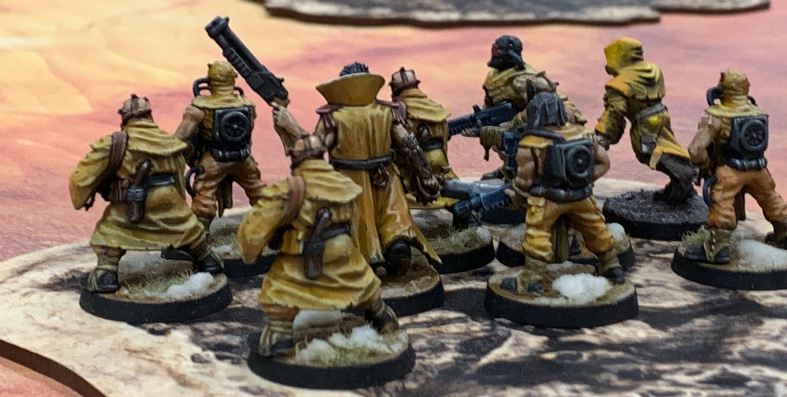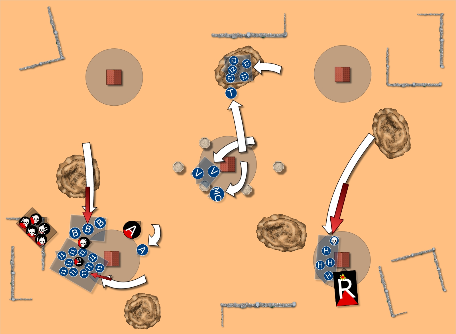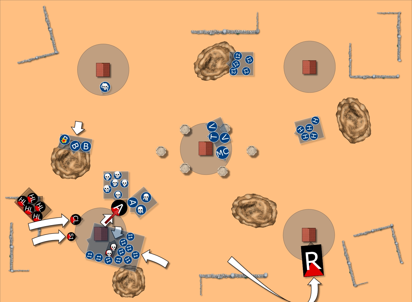 Como regla de la casa, en cada objetivo hay un monolito de escenografía prepintada. Eso hace que haya algo menos de espacio controlable por objetivo, al no poder situarse pisando el propio objetivo, pero aun así el radio de 3″ se ve claramente en cada objetivo gracias a los marcadores de Bandua Wargames, que es donde se ha jugado la batalla.