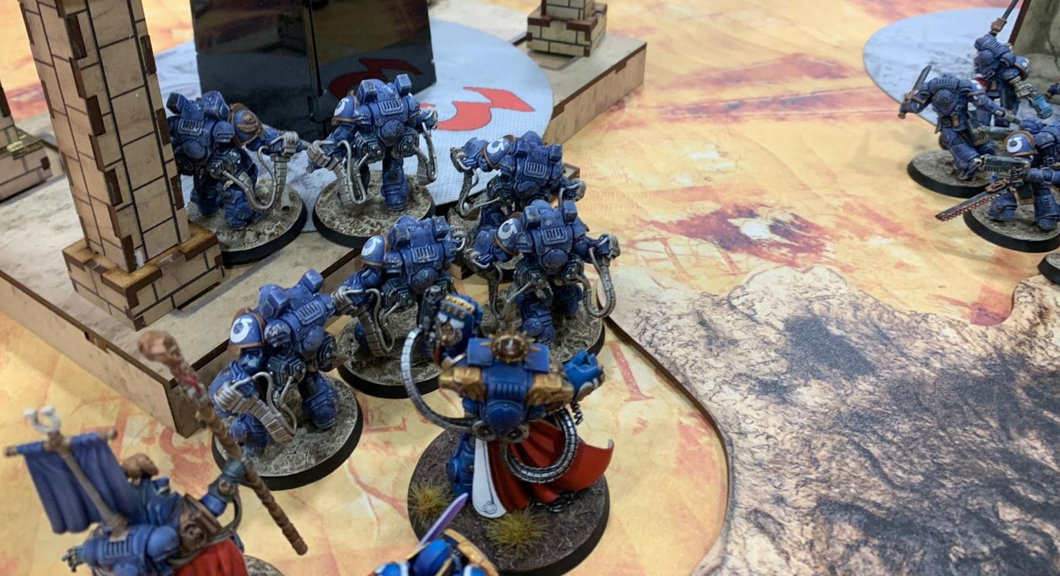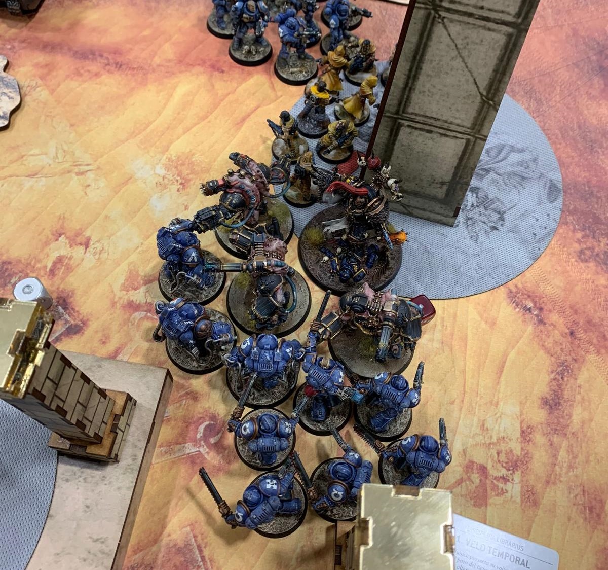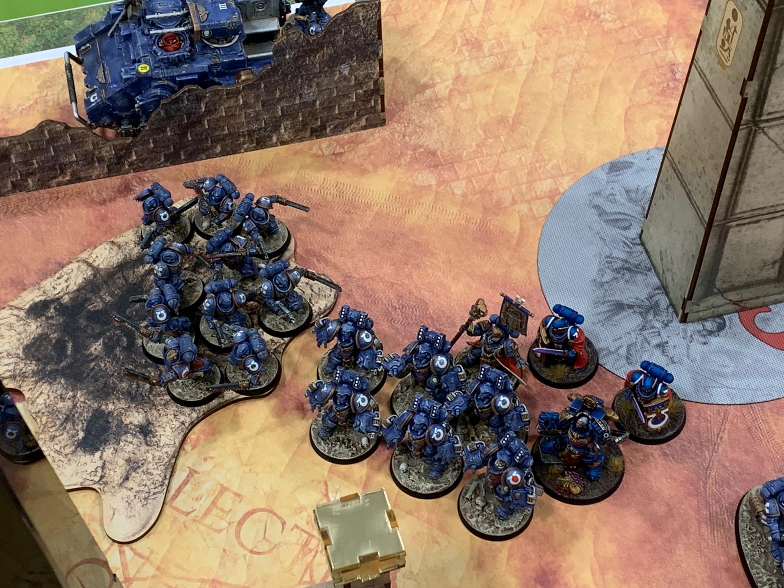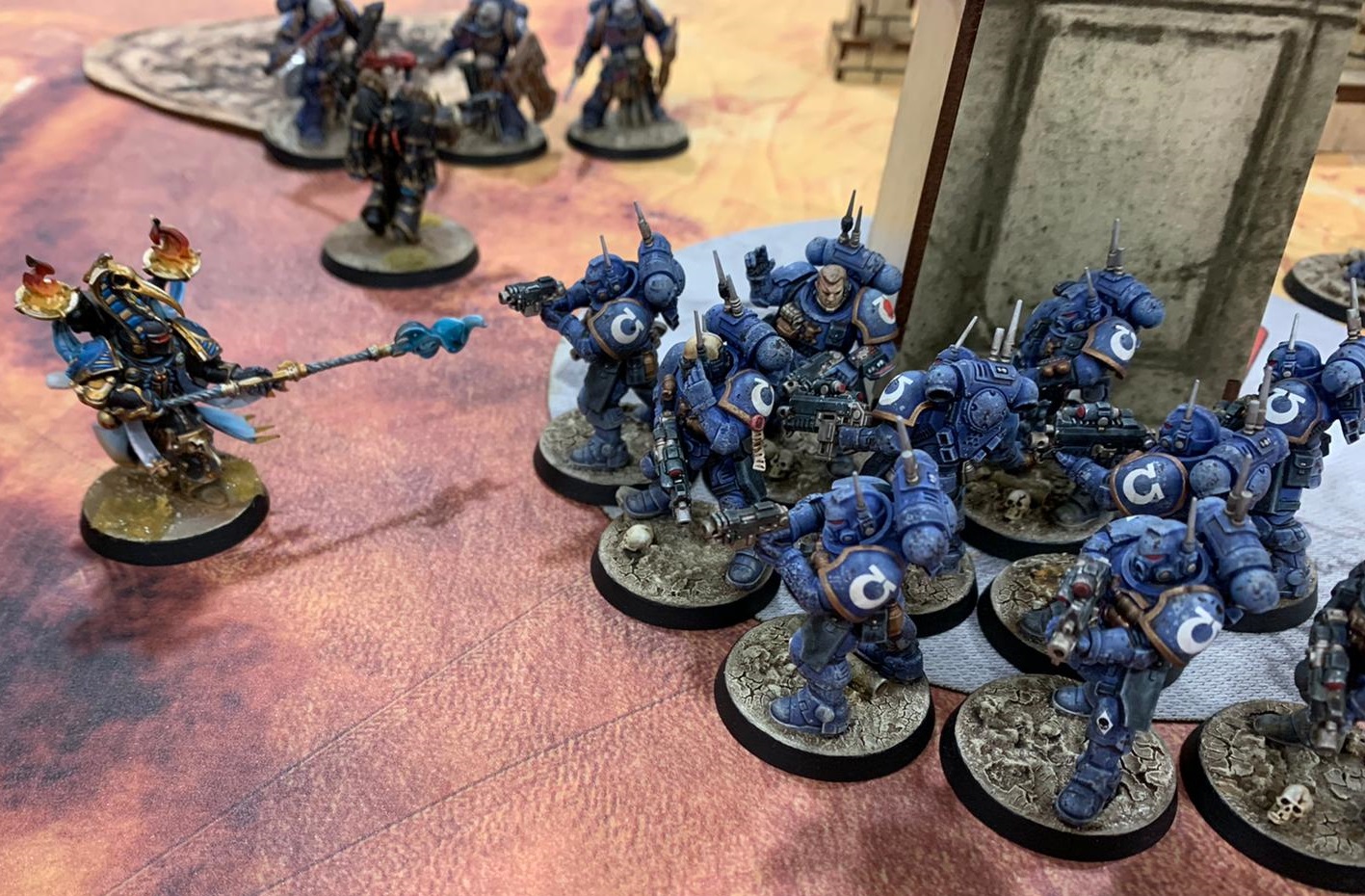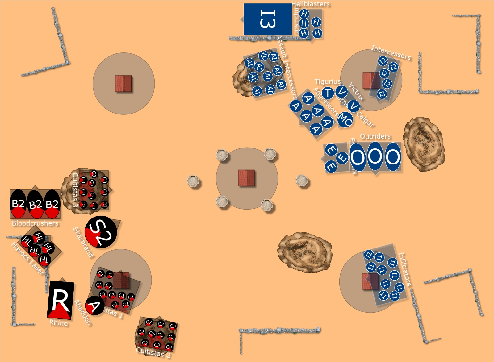 Tras el despliegue, la tirada de iniciativa determina que empieza la partida el Caos. Ante eso, los Ultramarines gastan 2 puntos de mando para reposicionar unidades que habían desplegado de una manera más agresiva gracias a la estratagema Redespliegue Rápido. Los Hellblasters se protegen tras una ruina y los Erradicadores dejan la primera línea para esconderse junto al Impulsor.