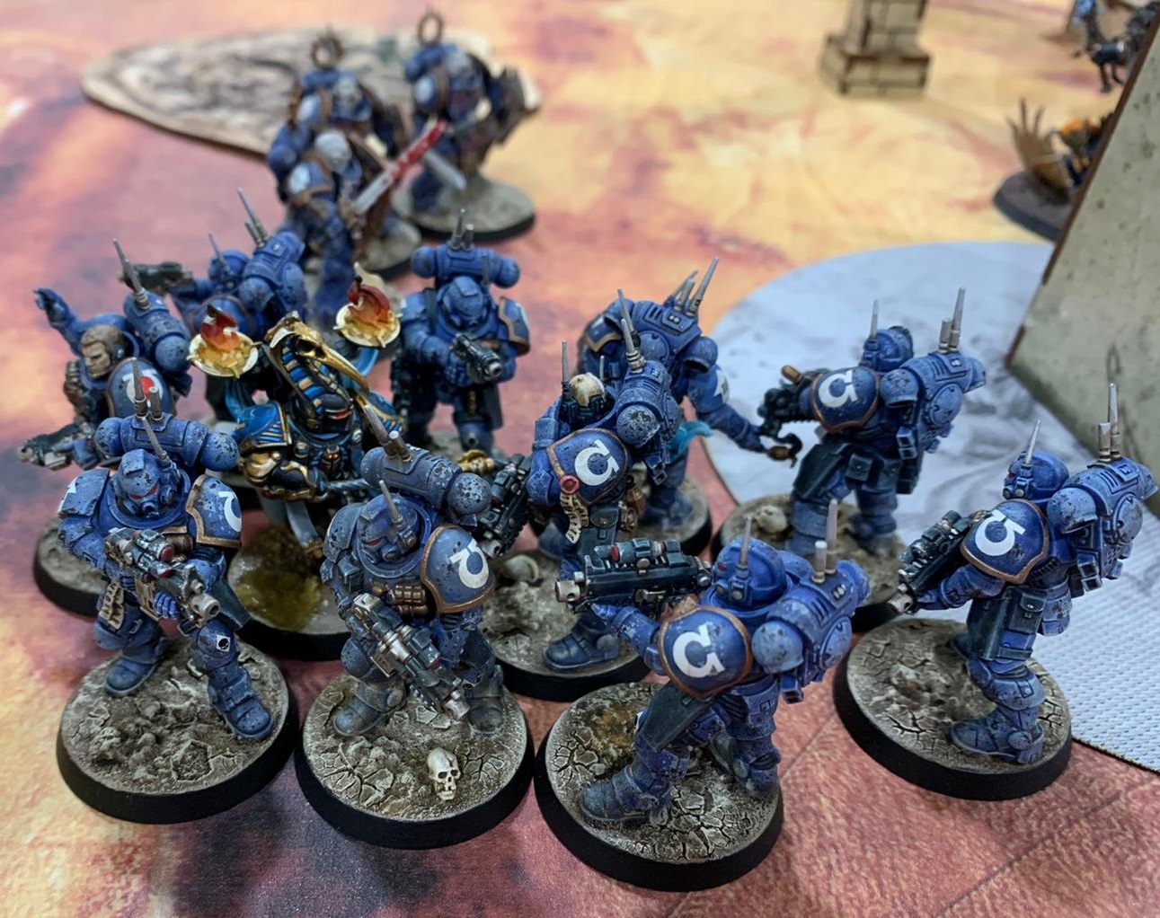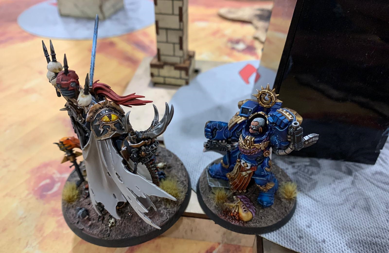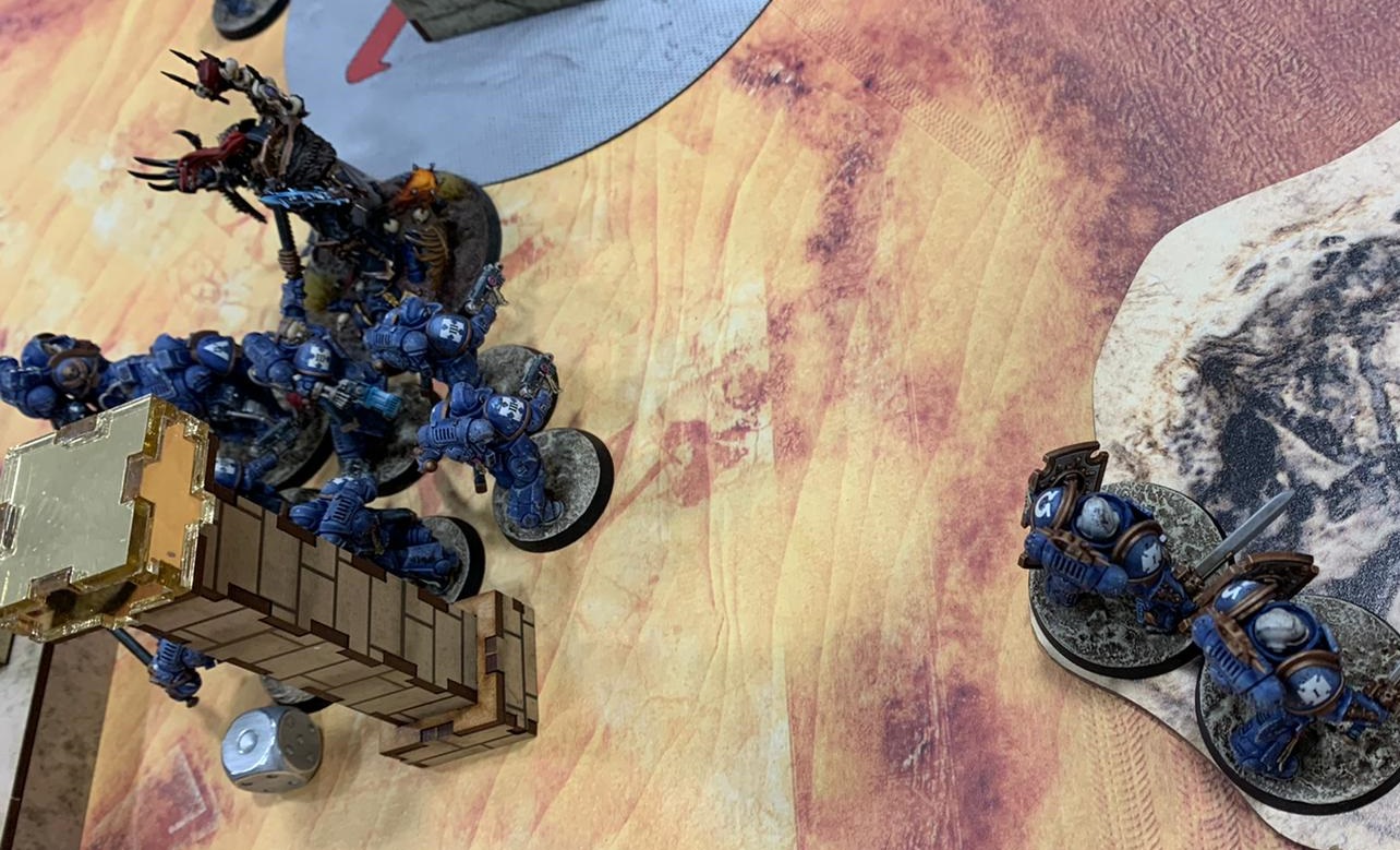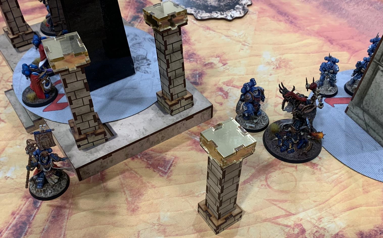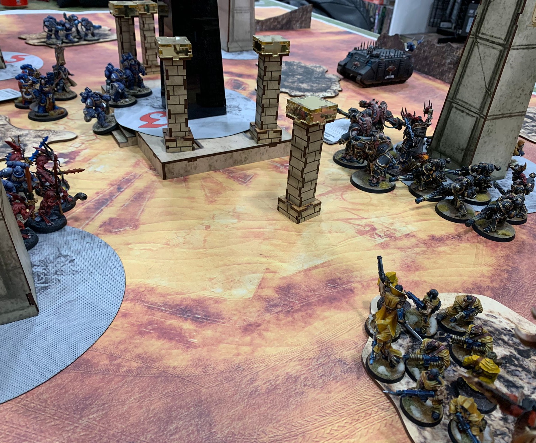 Tras el despliegue, la tirada de iniciativa determina que empieza la partida el Caos. Ante eso, los Ultramarines gastan 2 puntos de mando para reposicionar unidades que habían desplegado de una manera más agresiva gracias a la estratagema Redespliegue Rápido. Los Hellblasters se protegen tras una ruina y los Erradicadores dejan la primera línea para esconderse junto al Impulsor.