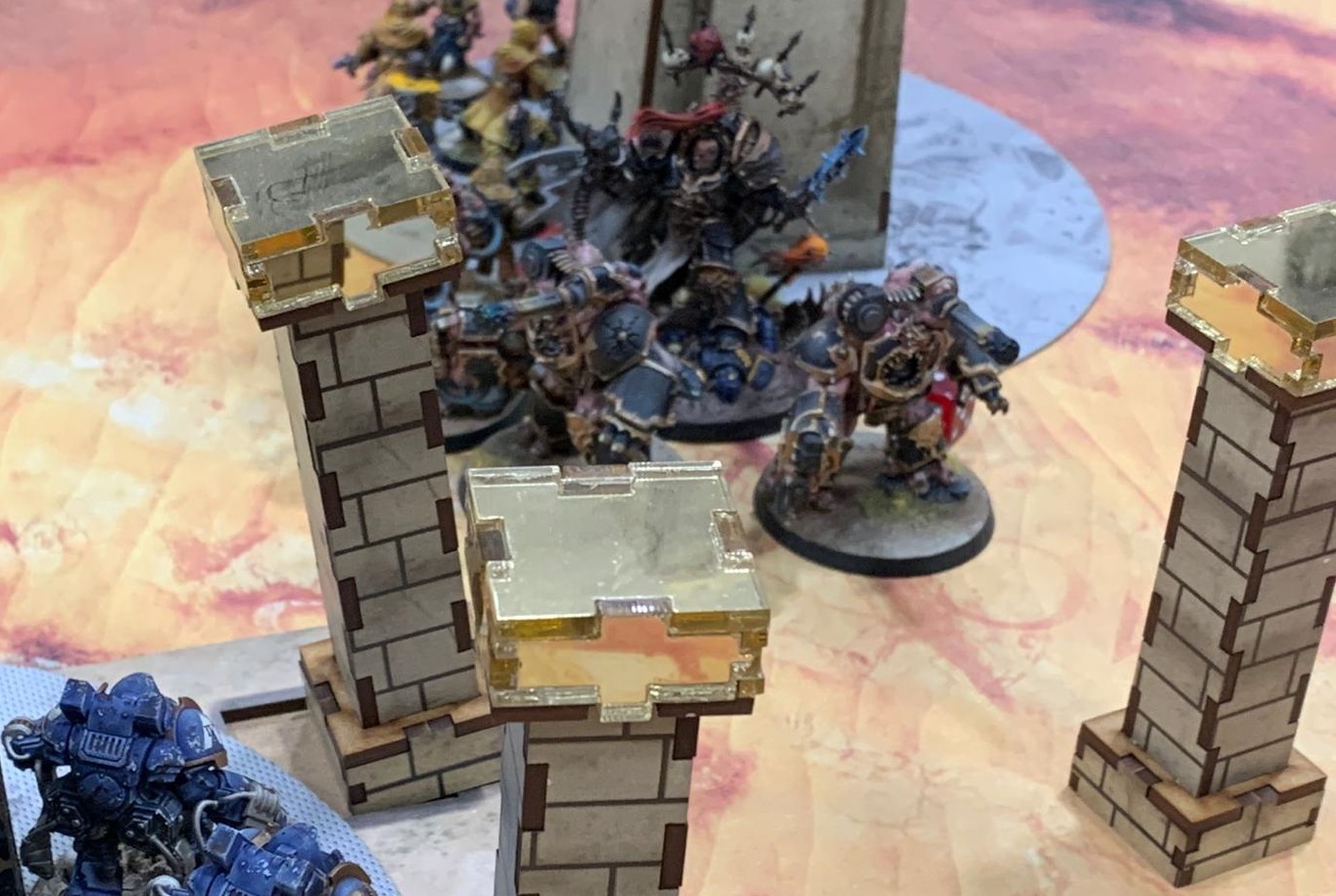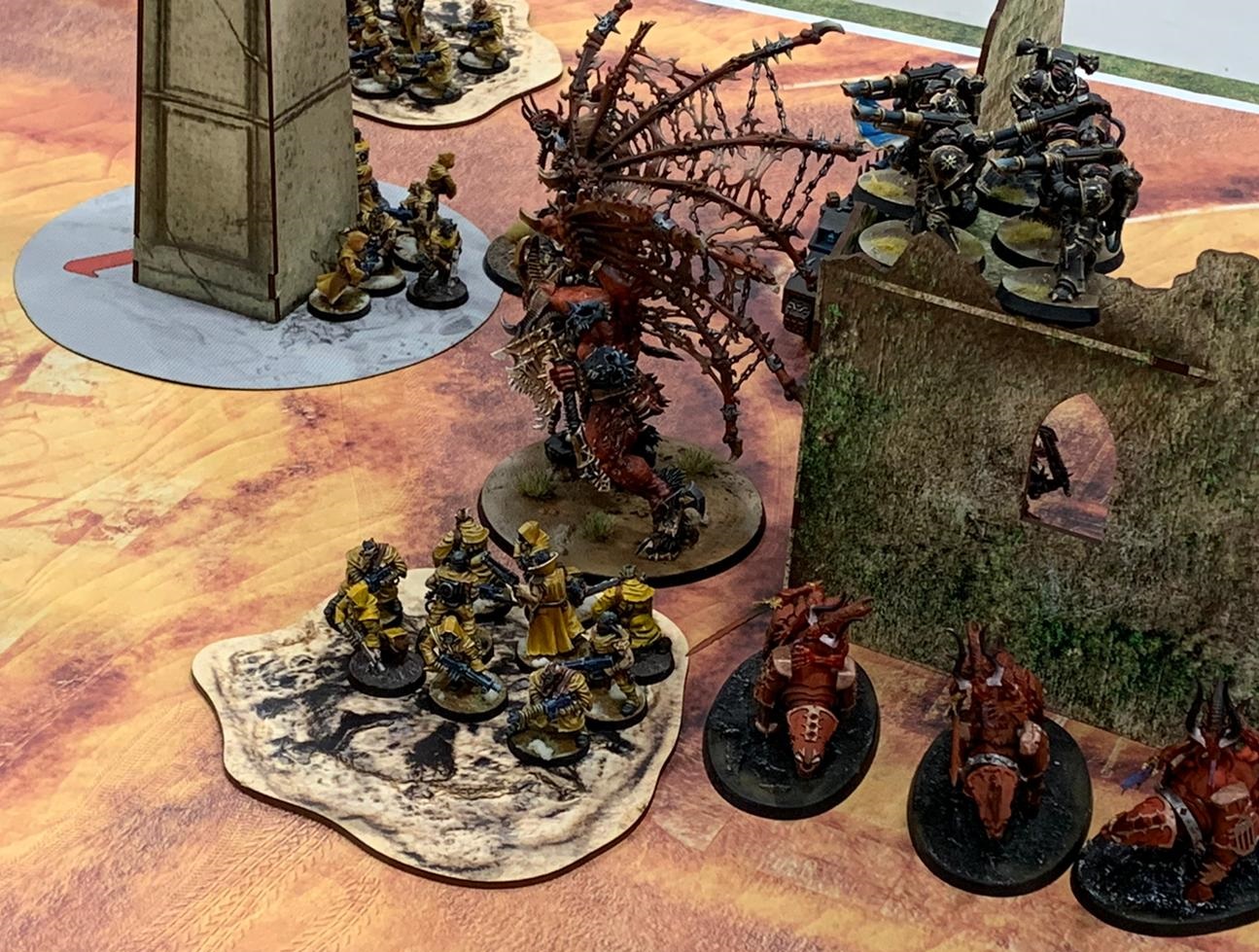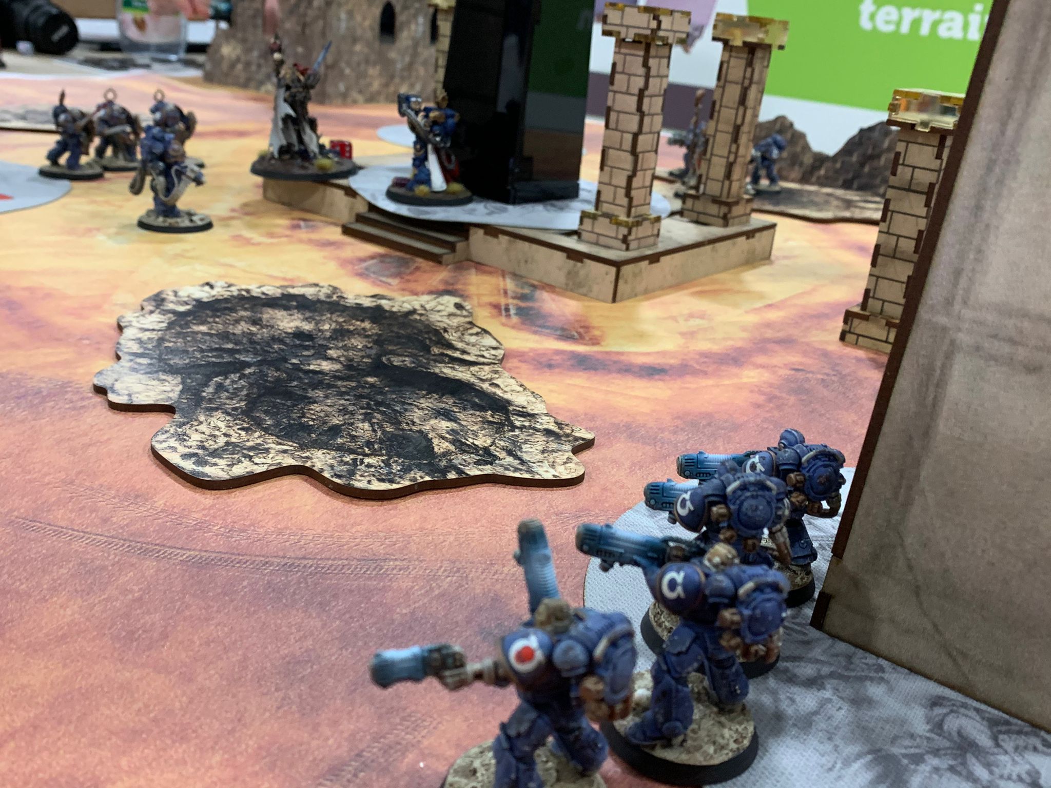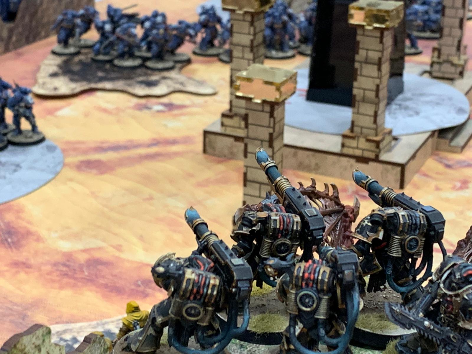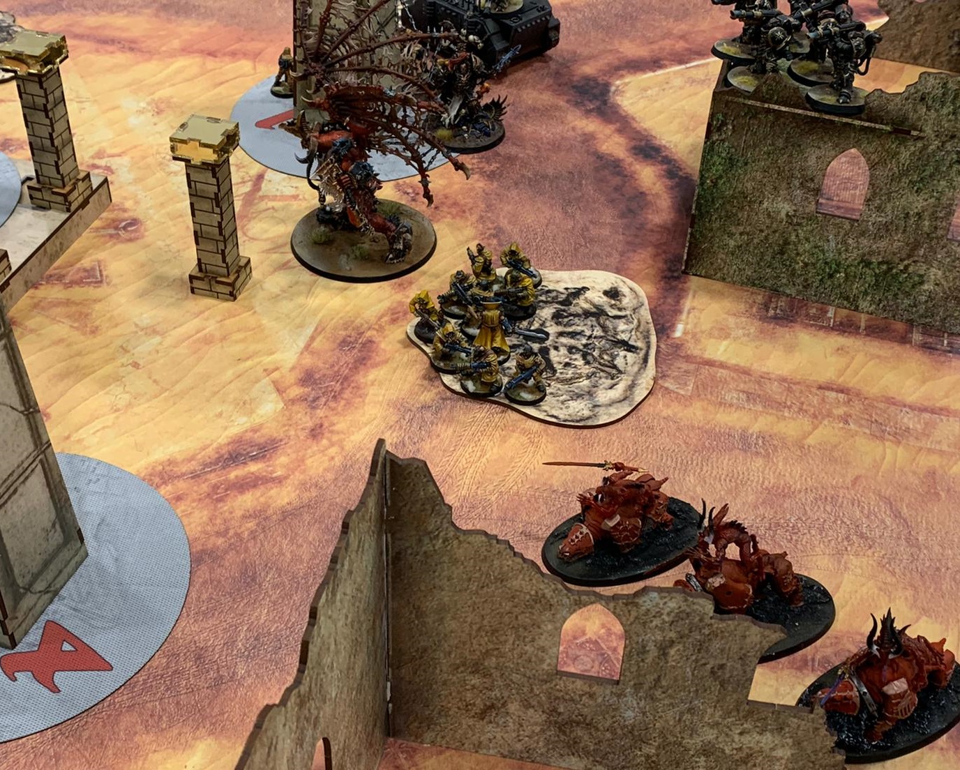 Tras el despliegue, la tirada de iniciativa determina que empieza la partida el Caos. Ante eso, los Ultramarines gastan 2 puntos de mando para reposicionar unidades que habían desplegado de una manera más agresiva gracias a la estratagema Redespliegue Rápido. Los Hellblasters se protegen tras una ruina y los Erradicadores dejan la primera línea para esconderse junto al Impulsor.