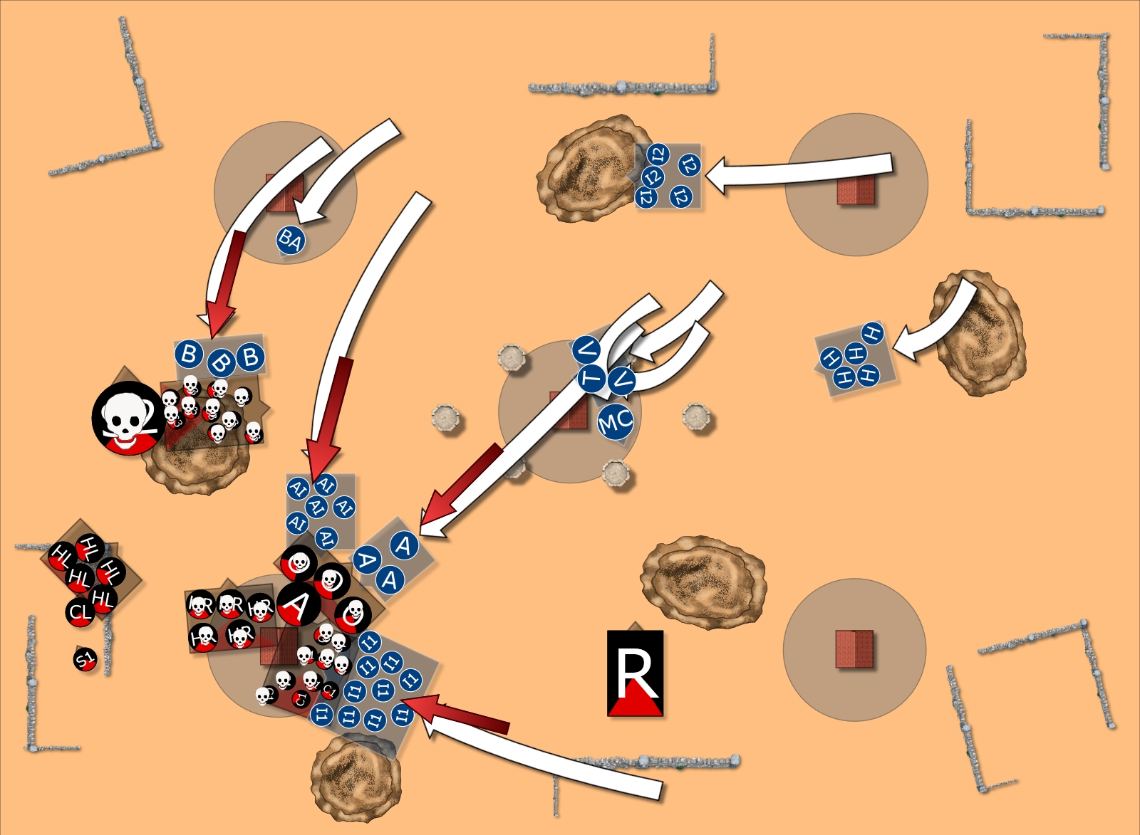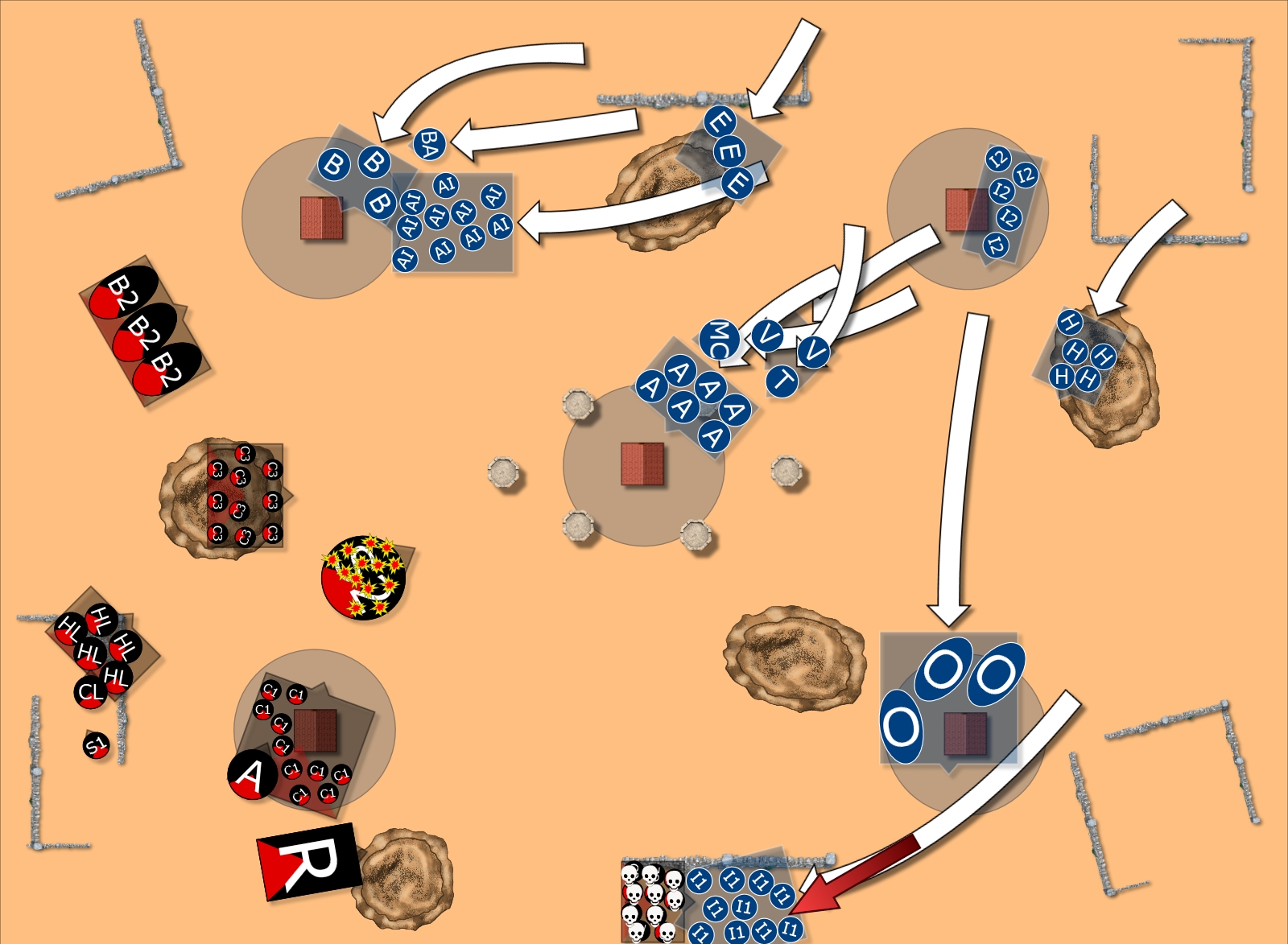 Los Aniquiladores con cañones rotativos salen del Rhino, que a su vez avanza al máximo de sus motores para acudir al flanco inferior derecho de la batalla. Abaddon también se mueve en dirección al enemigo, posicionándose para que su aura de repetir todo a impactar afecte a los Aniquiladores recién bajados y a los Arrasadores que llegan desde el Teleportarium. Skarbrand, bastante herido, retrocede pero se posiciona para que su aura de repetir cargas a Demonios de Khorne pueda beneficiar a los Desangradores que llegan desde la Disformidad para amenazar a los enemigos del objetivo superior izquierdo. Pero tras llegar los despliegues rápidos, los Ultramarines utilizan sus Lecturas de Auspex para que los Agresores, que están exactamente a 12″ de un despistado Desangrador, puedan desatar una tormenta bólter que desintegra a 20 de los demonios. La batalla comienza a parecer un fracaso para Abaddon, pero el Señor de la Guerra sabe que el orgullo marcial de Marneus Calgar va a darle la oportunidad de combatir contra él, y eso no puede desaprovecharlo porque matarlo de una vez por todas sería un éxito.