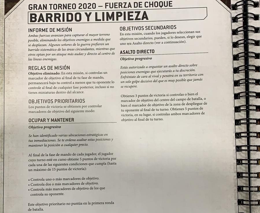 La batalla transcurre entre dos ejércitos de 2000 puntos. Se trata de una partida de juego equilibrado que utiliza el pack de misiones Gran Torneo 2020 de Novena Edición. La misión que se juega es Barrido y Limpieza, una misión en la que los objetivos se siguen controlando aunque los abandones si el oponente no te los arrebata. La misión primaria requiere controlar un objetivo para 5 puntos, dos para otros 5 puntos y más que el oponente para otros 5 puntos. La misión secundaria disponible, Asalto Directo, permite puntuar si se controla el centro de la mesa a final de turno.