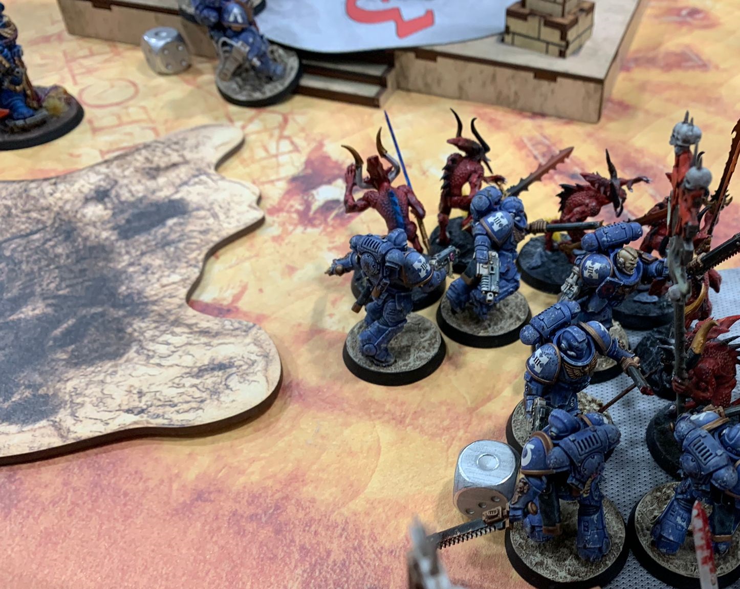Entre el disparo de pistolas bólter pesadas y los Agresores, las últimas heridas de Skarbrand junto a la unidad de Aniquiladores con cañones rotativos son eliminadas, a pesar de un intento del gran demonio de repetir su salvación. Tras eso llega el momento clave de la batalla, con los Ultramarines logrando todas sus cargas, incluyendo la de los Intercesores de Asalto gracias a la repetición del Velo Temporal y la de los Infiltradores gracias a una repetición de mando normal. El combate posterior contra Cultistas y Arrasadores es una masacre, y eso que la doctrina de los Marines Espaciales no es la de combate en este turno todavía temprano de la batalla. Pero cuando la oportunidad de atrapar a las unidades de disparo del enemigo se presenta, no se puede dejar pasar.