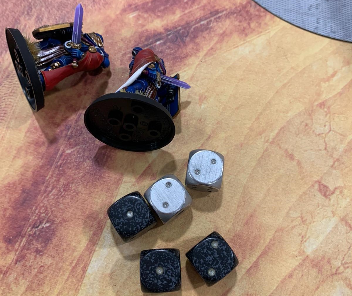 La carga de Abaddon hacia Calgar es una pulgada más difícil que hacia la Guardia Victrix, y ya sin puntos de mando no se puede arriesgar. Decide cargar a los guardaespaldas, y llega justito. Desata sobre ellos la furia conjunta de la Garra de Horus y Drach’nyen contra la Fisiología Transhumana de los guardaespaldas. Sus escudos tormenta ultima les dan invulnerables de 3+, pero ni siquiera eso es suficiente para detener la furia de Abaddon, que los despedaza. Consolida hacia Marneus Calgar, que ahora ya está solo, pero el Señor de los Ultramarines le golpea con dureza provocándole un total de 4 heridas tras la reducción de daño de Abaddon. En el otro combate, el Hechicero ya no logra resistir más tras haber sido herido por la propia Disformidad, y los Infiltradores le arrebatan sus últimas dos heridas.