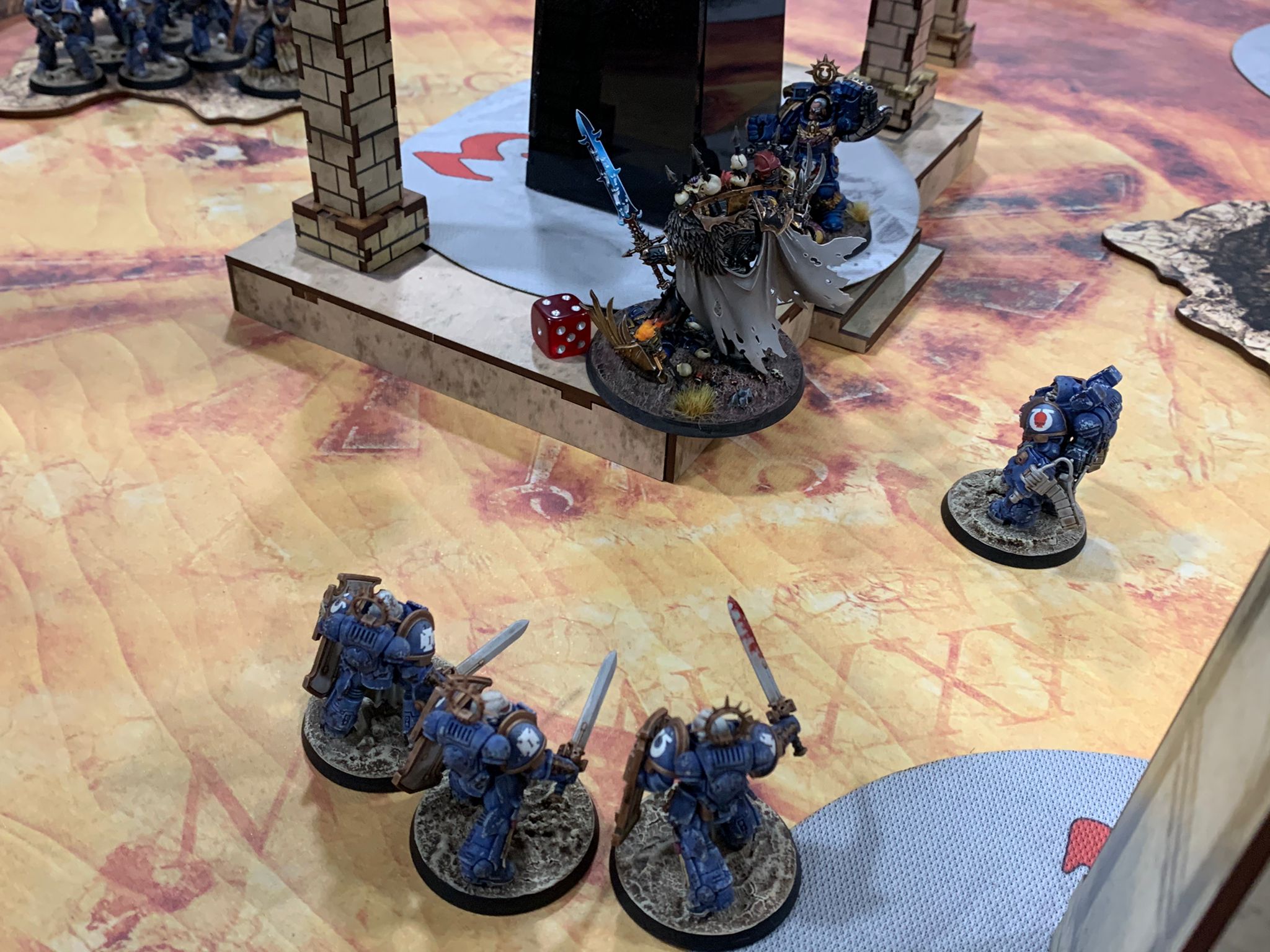 En su fase de mando, Calgar se otorga a sí mismo repetición a impactar y después se retira, para que el disparo de sus hombres le ayude a hacer frente Abaddon. Tigurius lo apoya con el Poder de los Héroes, aunque falla el Castigo sobre Abaddon.