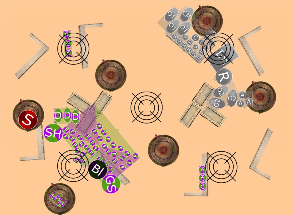 El ejército demoníaco se posiciona en el campo de batalla para ocupar tres cuadrantes y el centro, utilizando movimientos de Avanzar. Los Portadores de Plaga quedan protegidos con Miasma de Pestilencia y el Guardián de los Secretos con Agonías Placenteras.