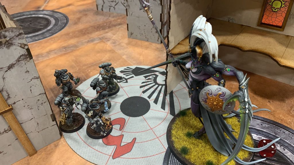 La fase de mando empieza con pocos puntos de victoria, solamente 4 por el objetivo de zona propia. Esta vez el Capellán no falla con su letanía para dar +2 a las cargas, y se acerca a la ruina para evitar el oscurecido y disparar a los nurgletes heridos, buscando completar varias misiones secundarias. Lo consigue, pero la fortuna sigue evitando a los Carcharodones porque el Redentor no consigue hacer su carga, ni repitiendo, con ese +2 contra Shalaxi Helbane. La Gran Demonio no desperdicia la situación e interviene. En otras zonas de la batalla sí que los marines ganan posiciones, por un lado gracias al trabajo lento pero eficaz del Capitán y los Intercesores de Asalto, y por otro lado con un excelente disparo de pistolas pesadas de los Veteranos Guardahojas que salen del Impulsor y dejan muy tocado, ayudados desde lejos por el Redentor, al Guardián de los Secretos. Sin embargo su última herida no cae a disparo, sino en una heroica carga del Apotecario que demuestra la fijación predatoria de los Carcharodones y no tiene miedo a nada.