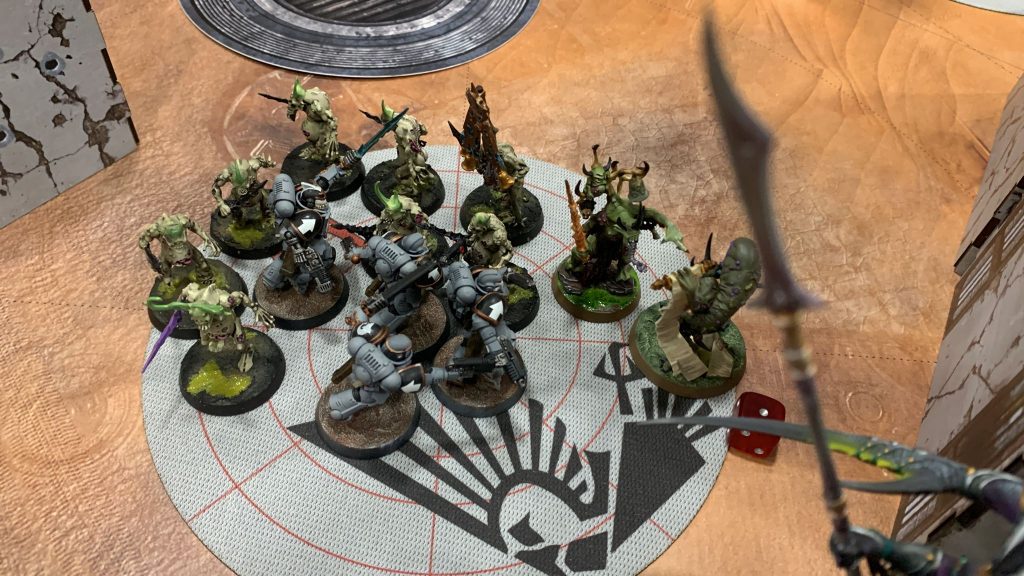 Los Tiburones Espaciales van a intentar hacer 6 cargas en su primer turno, y para ello el Capellán lanza su letanía para dar +2 las cargas. Sin embargo, en este primer turno fracasa al hacerlo. Eso no impide que los Carcharodones continúen con su plan y se posicionen para las cargas. Los Agresores avanzan muy poco para poder tener al alcance de sus lanzallamas al Guardián de los Secretos, así que repiten el dado para llegar. Sus disparos y los del Redentor logran hacer 7 heridas al gran demonio, mientras los de la unidad de Outriders que acompaña al Capellán matan a una peana de Nurgletes y luego otra huirá por mala suerte demoníaca.