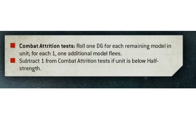 Cada 1 (o cada 1 y cada 2 si la unidad está a la mitad de su tamaño) implicará más miniaturas huyendo. Por lo comentado en WarhammerTV, habrá facciones como los Amos de la Noche o los Desolladores que modificarán el Desgaste de Combate.